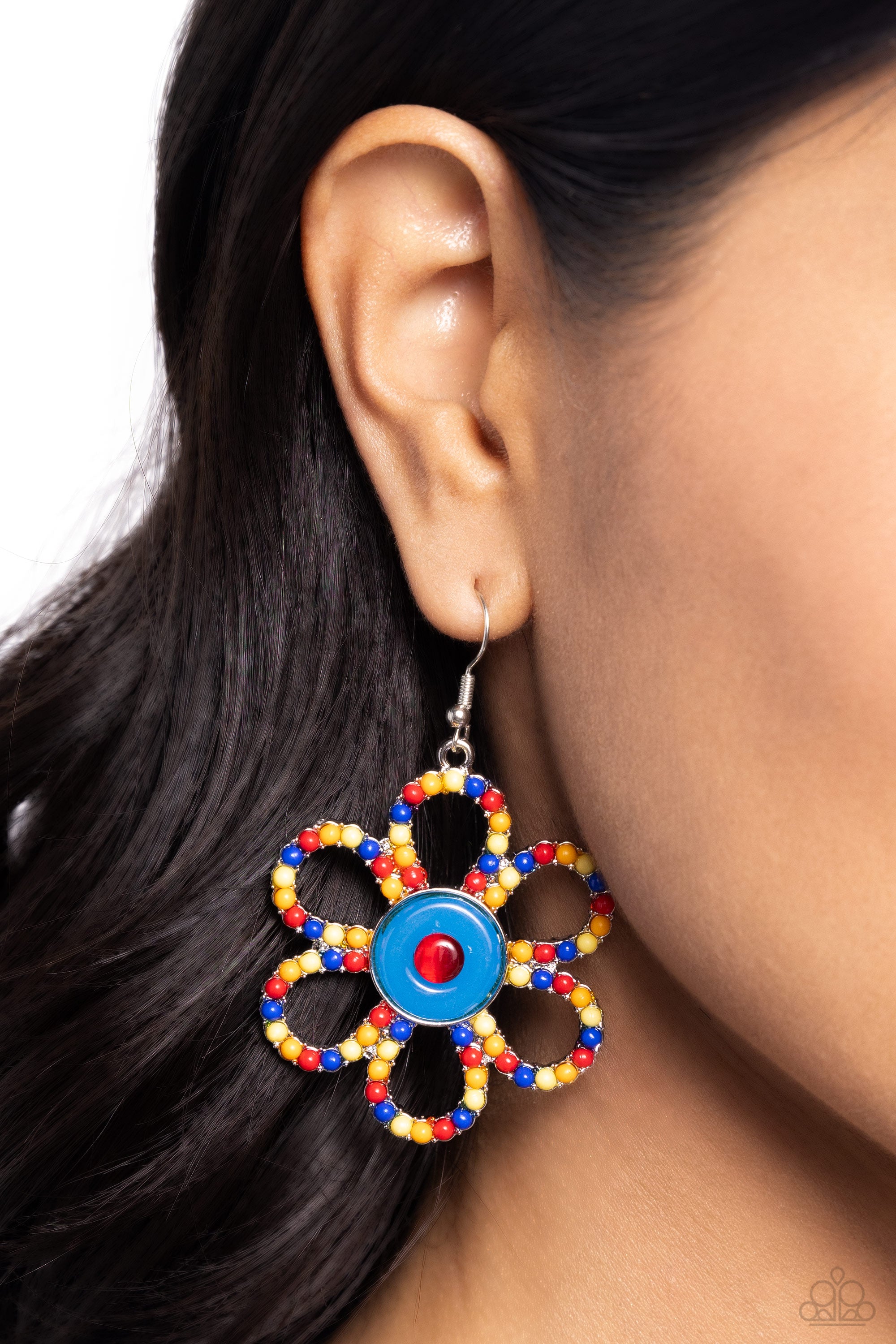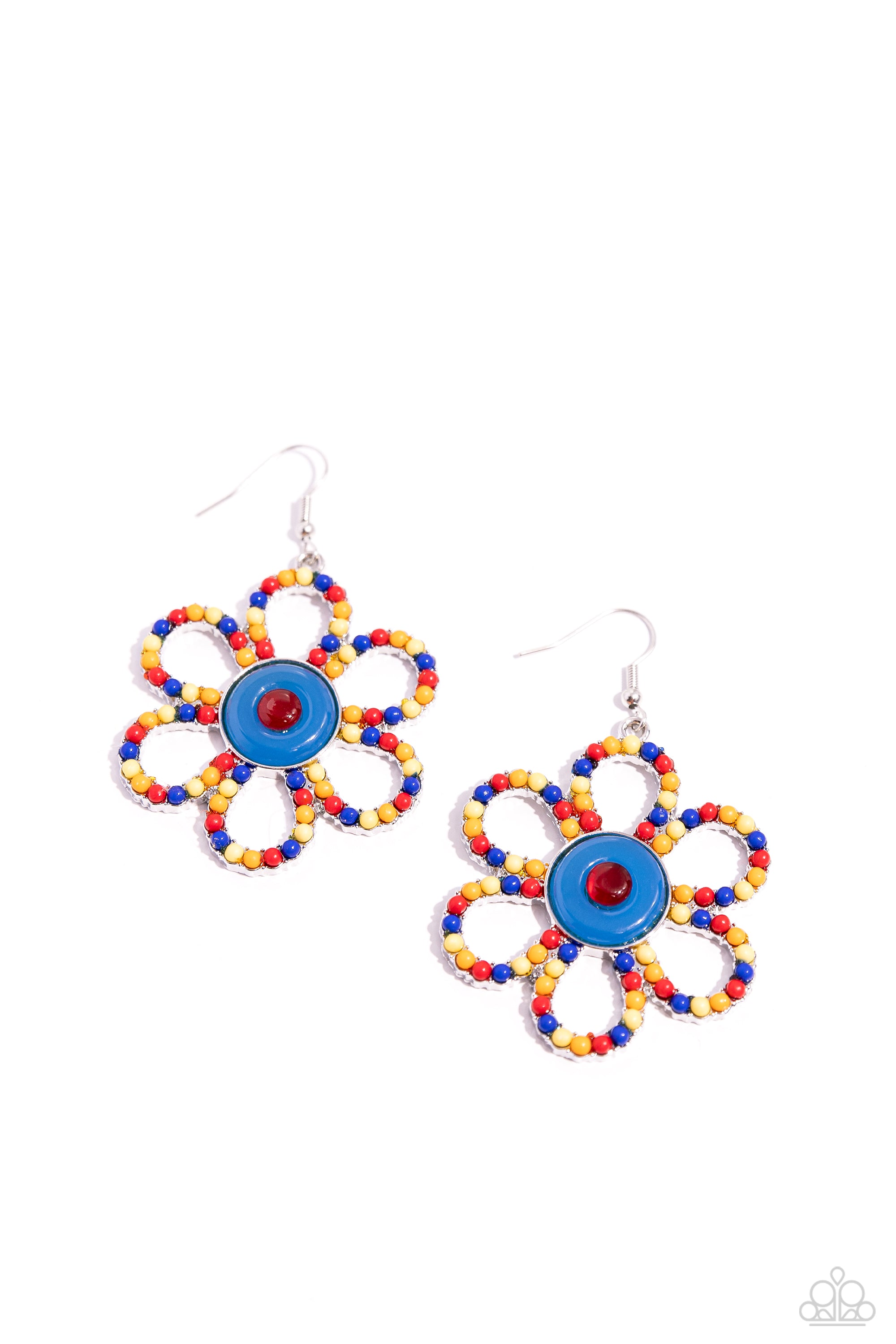 Featuring a milky blue and red center, an airy silver flower with red, yellow, orange, and blue acrylic petals cascades from the ear for a whimsical display. Earring attaches to a standard fishhook fitting.