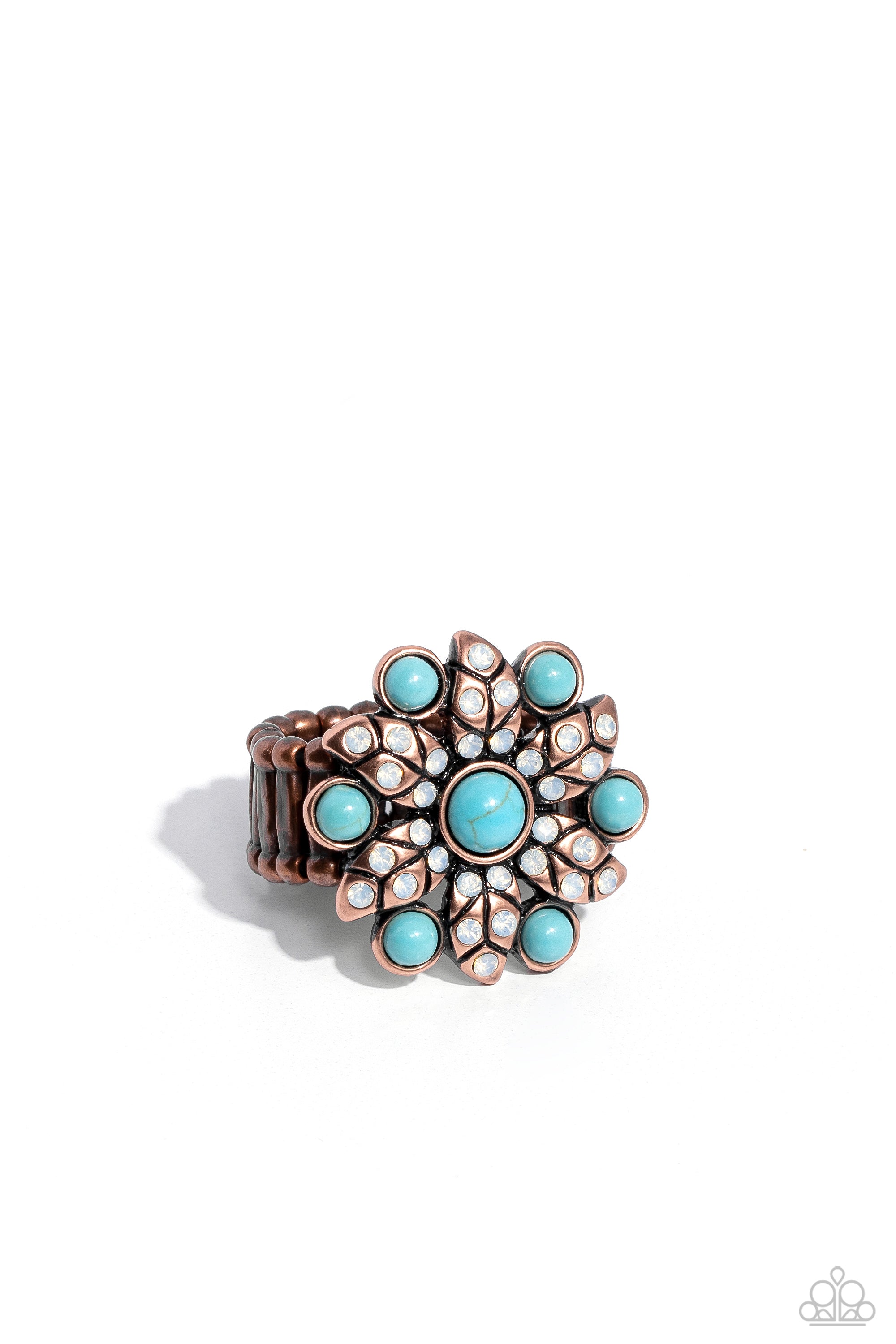 Embellished on a glistening floral copper frame, turquoise stones alternate between textured copper petals encrusted with opalescent rhinestones for a whimsical centerpiece atop the finger. Features a stretchy band for a flexible fit. As the stone elements in this piece are natural, some color variation is normal.