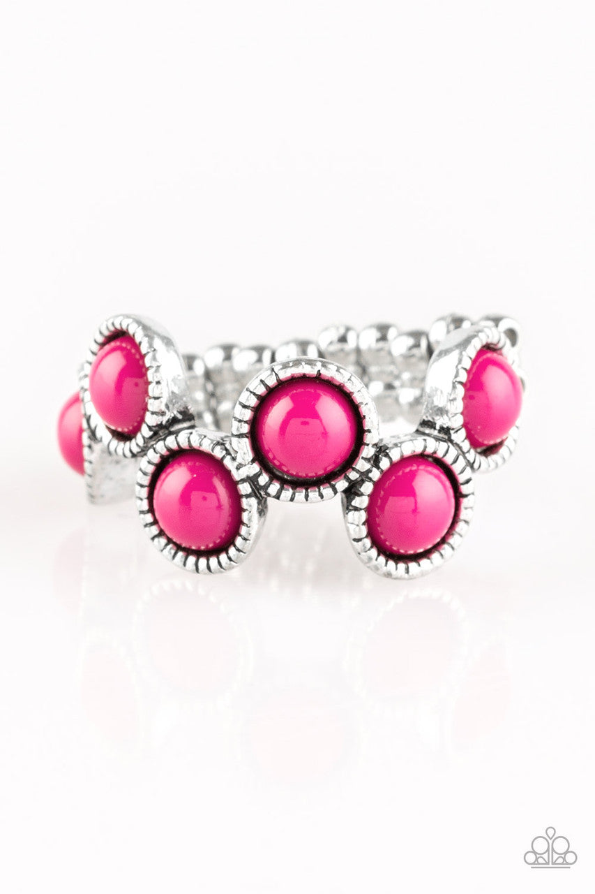 Vivacious pink beads are pressed into sleek studded silver frames. The colorful beads zigzag across the finger, coalescing into a whimsical frame. Features a dainty stretchy band for a flexible fit.
