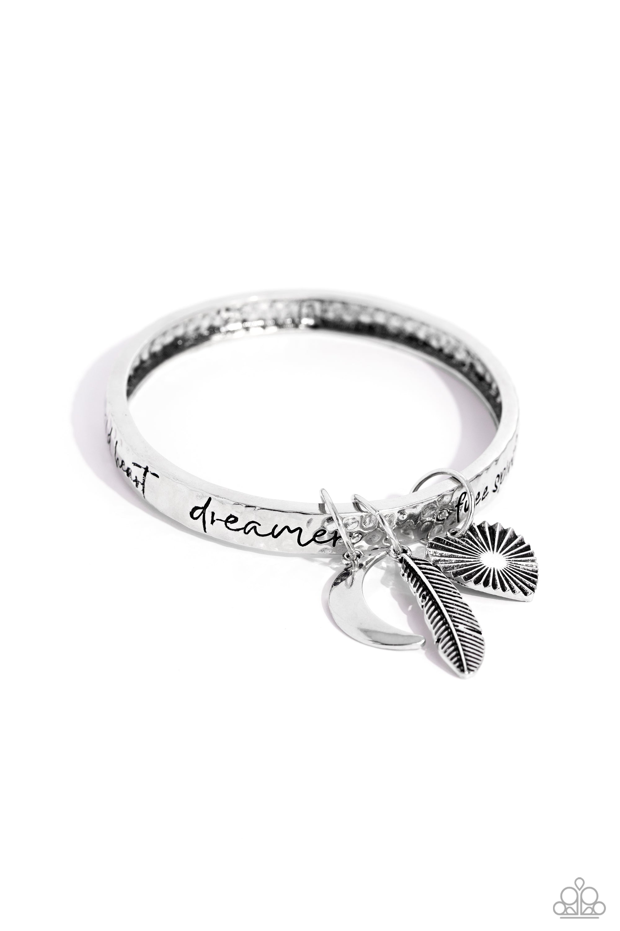 A hammered silver bangle featuring a textured feather, sleek crescent moon, and textured heart charms wraps around the wrist for an artisan-inspired fashion. Painted in a black hue, the phrases “free spirit," "wild heart,” and "dreamer" run horizontally across the cuff for an inspirational finish.