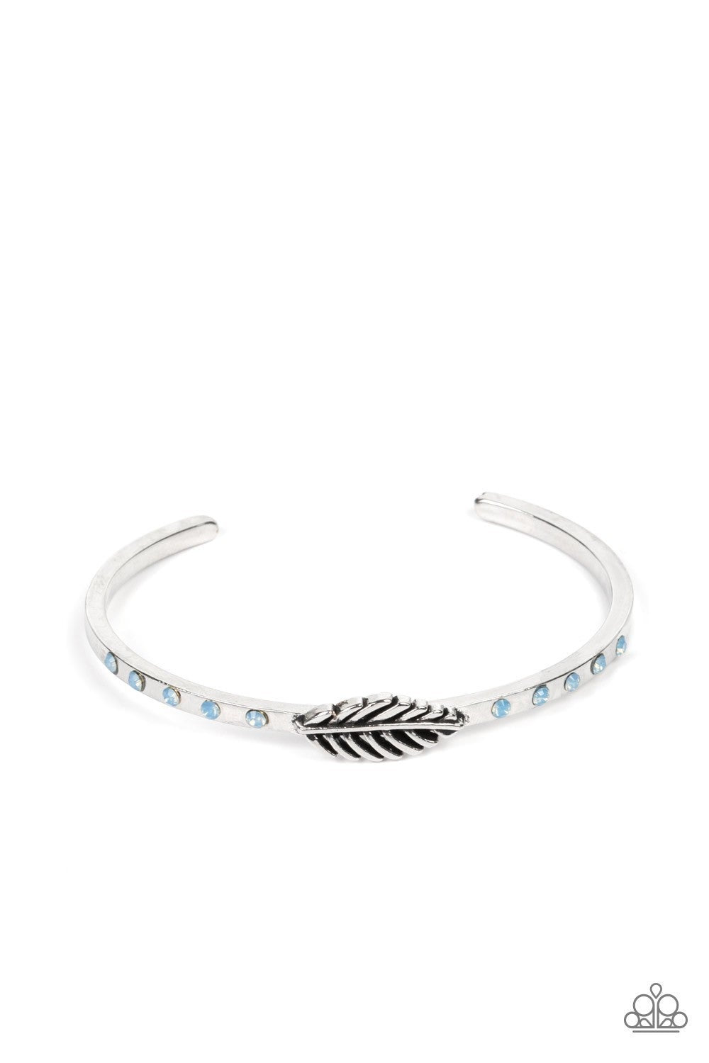 Bordered by rows of opaque Cerulean rhinestones, a dainty silver feather frame is pressed into the center of a dainty silver cuff for a free-spirited finish.