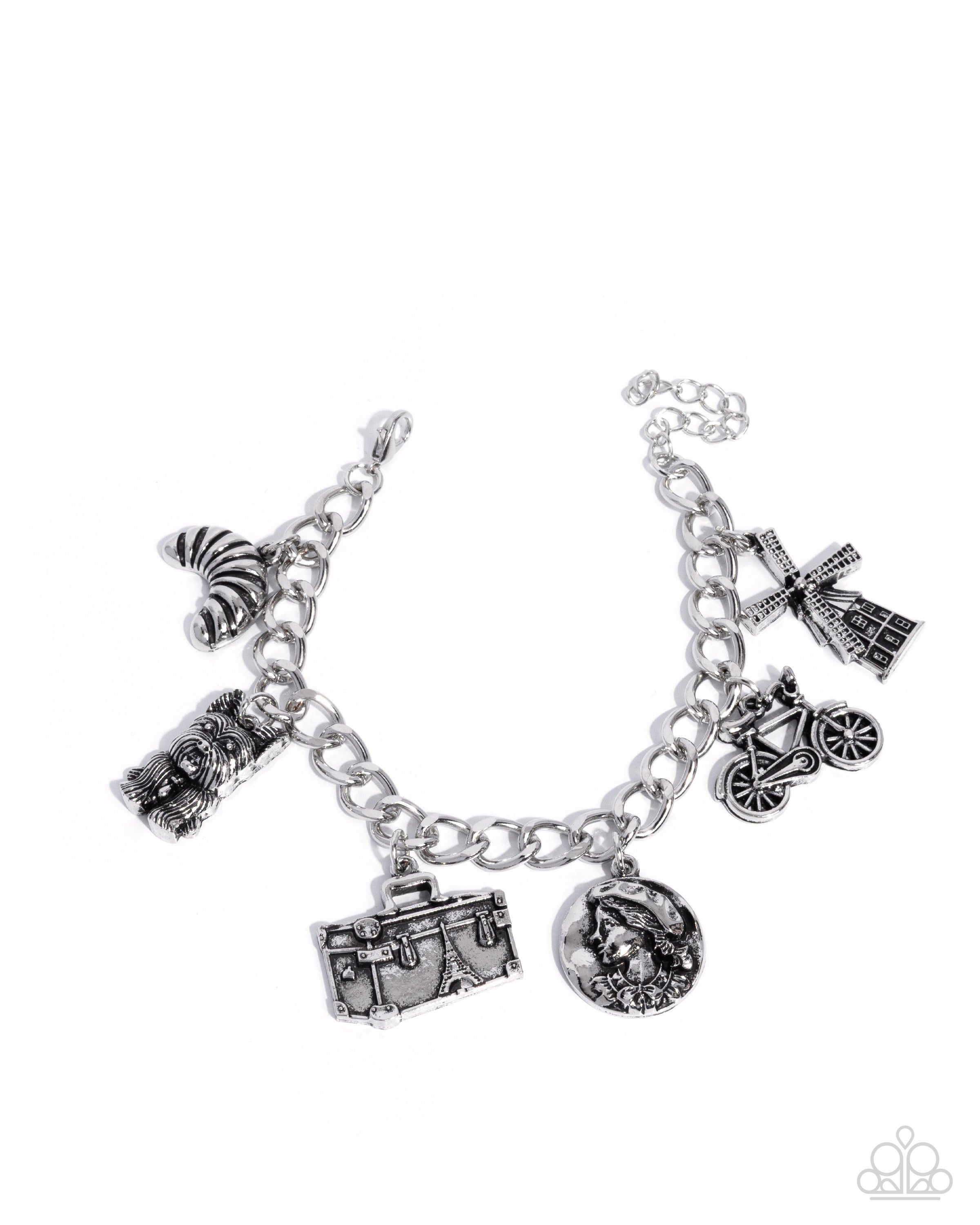 Cascading along a sleek silver curb chain, a collection of French-inspired charms including a croissant, a Yorkshire terrier, an Eiffel Tower-embellished trunk, a cameo brooch-like pendant, a bicycle, and a windmill collect around the wrist for a one-of-a-kind look. Features an adjustable clasp closure.
