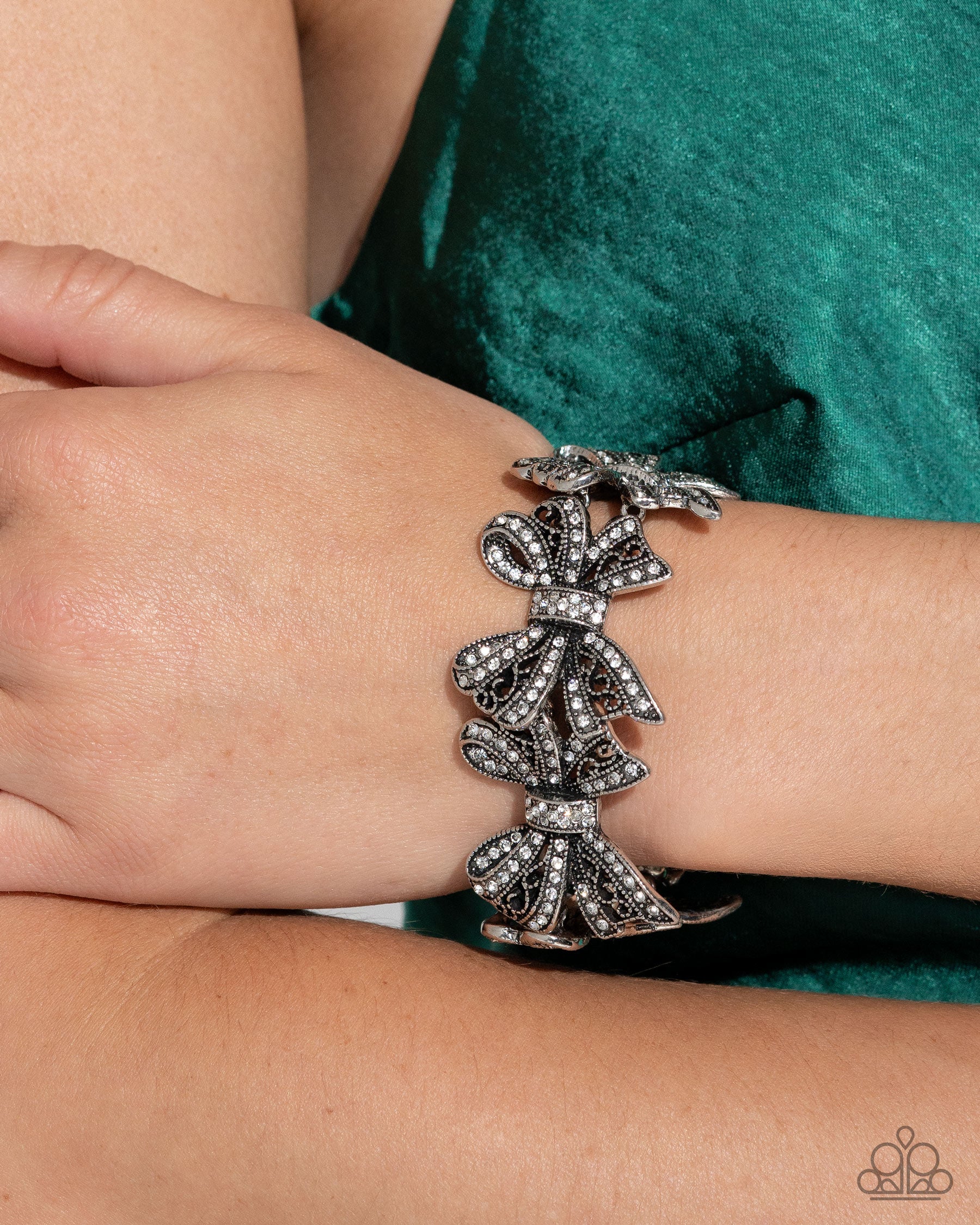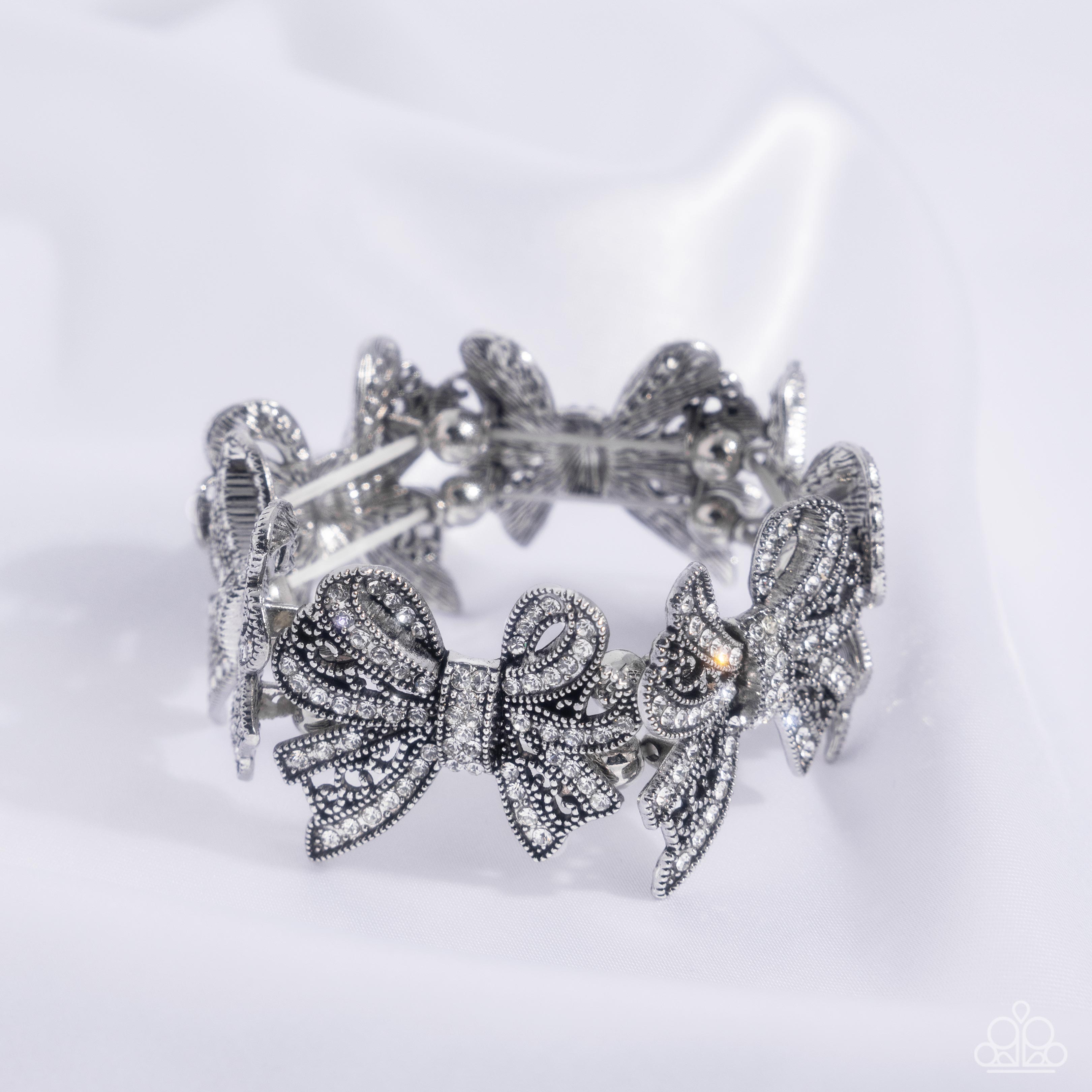French Flourish - White - Rhinestone Silver Bow Paparazzi Stretchy Bracelet - October 2024 Life of the Party Exclusive