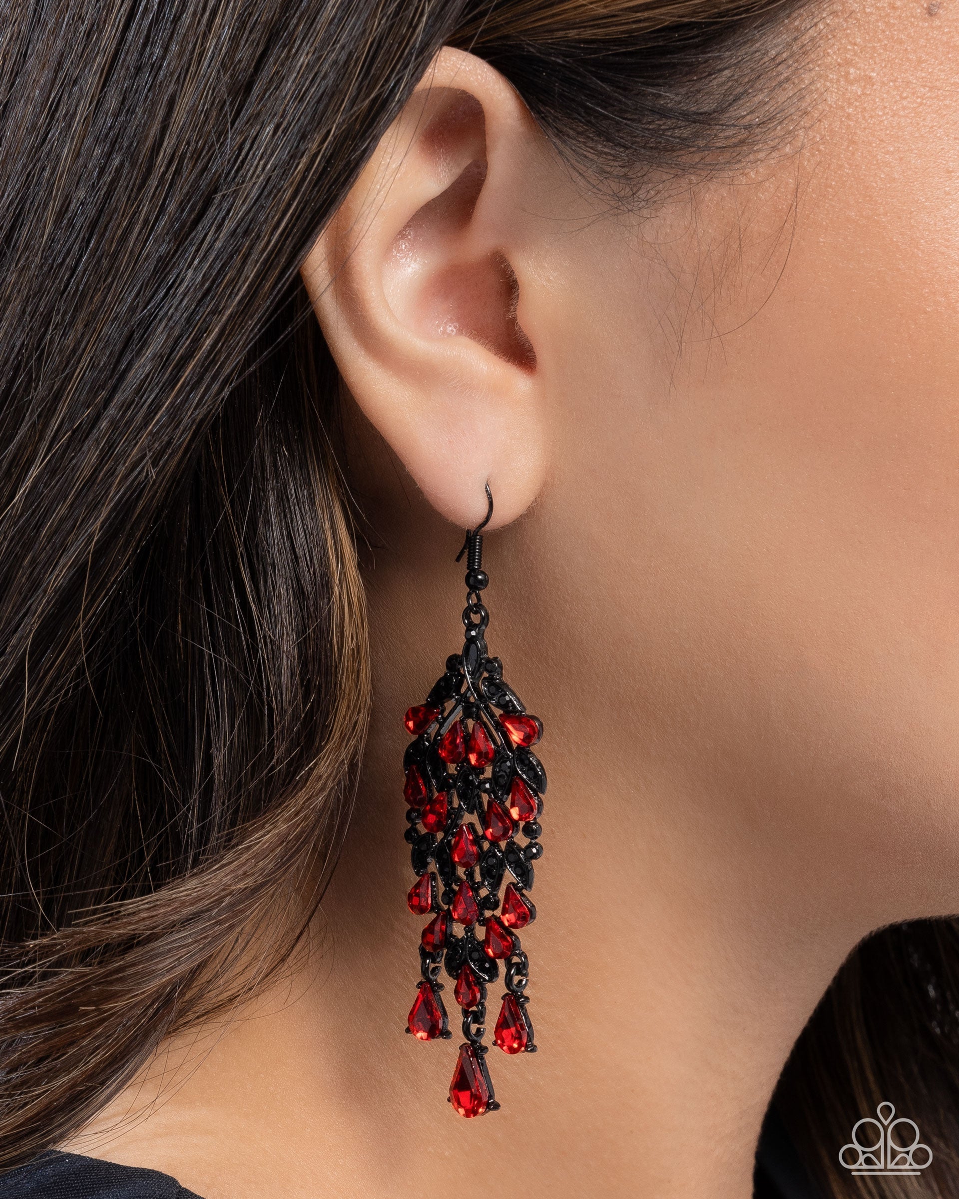 Featuring a faceted finish, teardrop red gems and dainty black rhinestones are embellished atop a decorative black-painted frame cascading with intricate detail for a timelessly over-the-top lure. Earring attaches to a standard fishhook fitting.