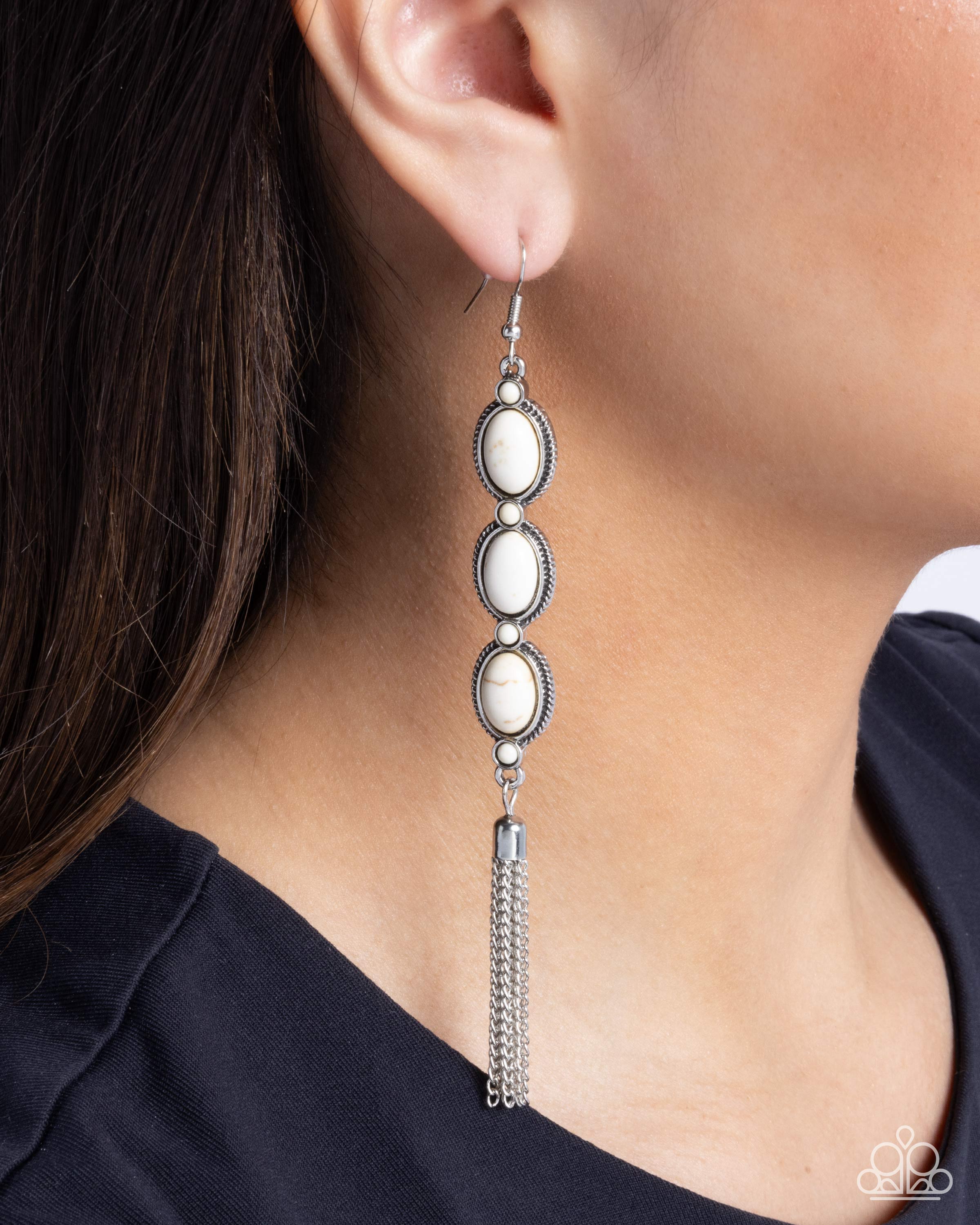 Pressed in a trio of textured silver frames, white oval stones alternate with round white stones giving way to a tassel of classic silver chains for a free-spirited fashionable lure. Earring attaches to a standard fishhook fitting. As the stone elements in this piece are natural, some color variation is normal.