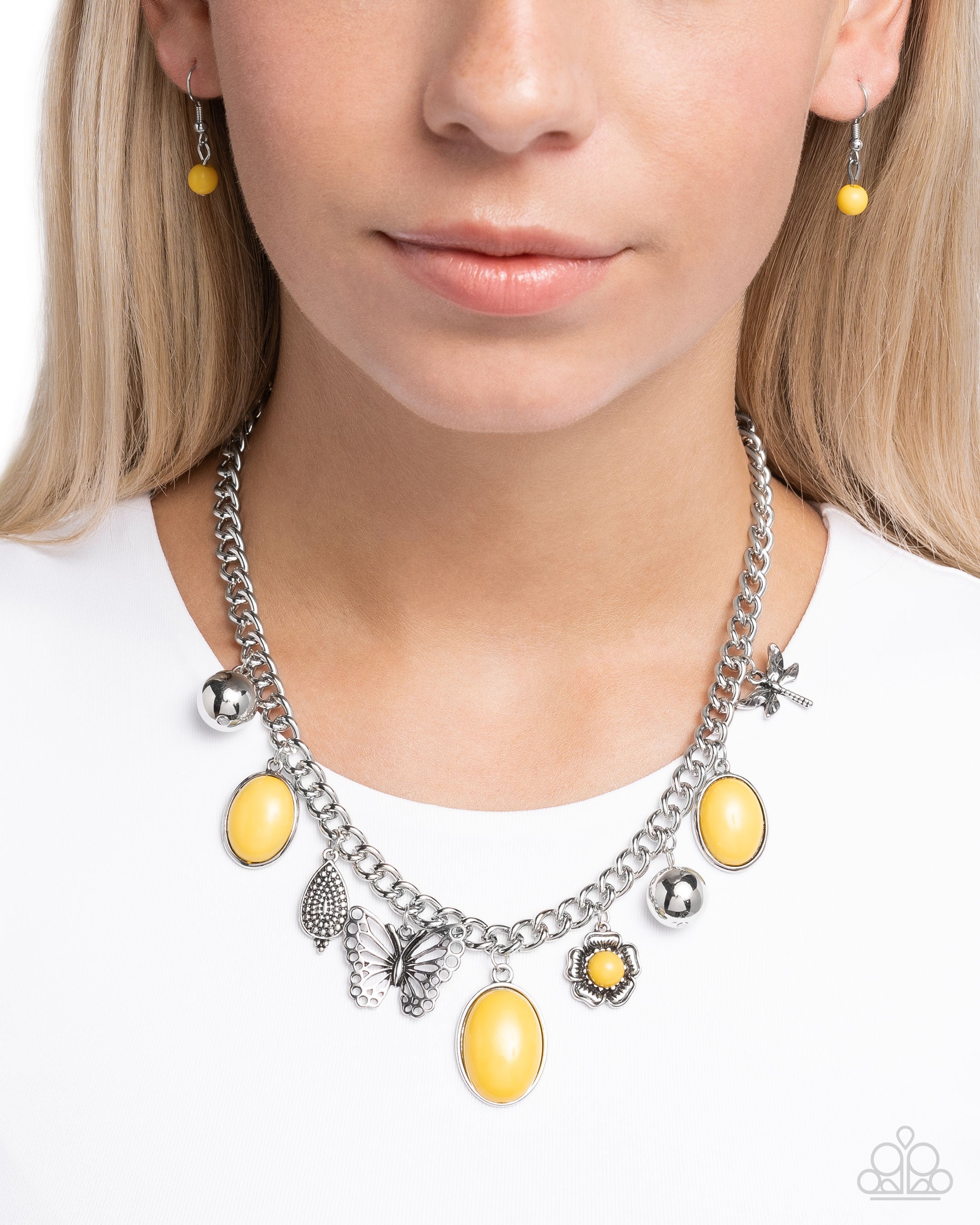 Gliding along a silver curb chain, a collection of whimsical charms including a silver dragonfly, silver beads, an airy silver butterfly, a studded teardrop, a Primrose bead-centered silver flower, and Primrose acrylic ovals cascade below the neckline for a garden-inspired genuine display. Features an adjustable clasp closure.