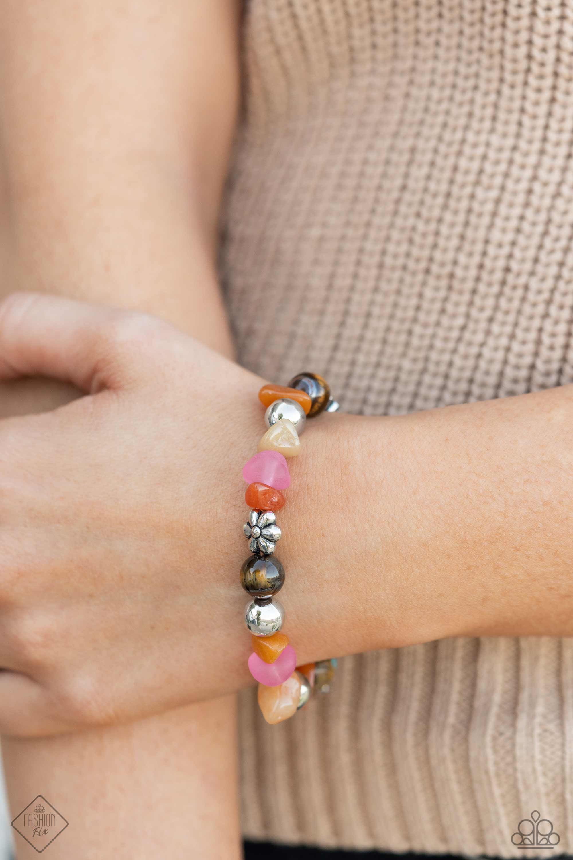 An earthy collection of chiseled orange stones, tiger's eye beads, floral silver beads, matte pink beads, and silver accents are threaded along a brown cord around the wrist, resulting in a seasonal, earthy display. Textured silver discs and turquoise discs line the pull cords for additional eye-popping color. Features an adjustable sliding knot closure. As the stone elements in this piece are natural, some color variation is normal.