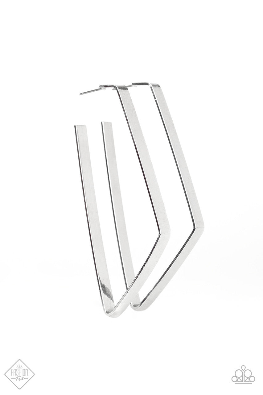Brushed in an antiqued shimmer, a flat silver bar bends into an abstract geometric frame creating an edgy conversation starter. Earring attaches to a standard post fitting. Hoop measures approximately 1 1/2” in diameter.