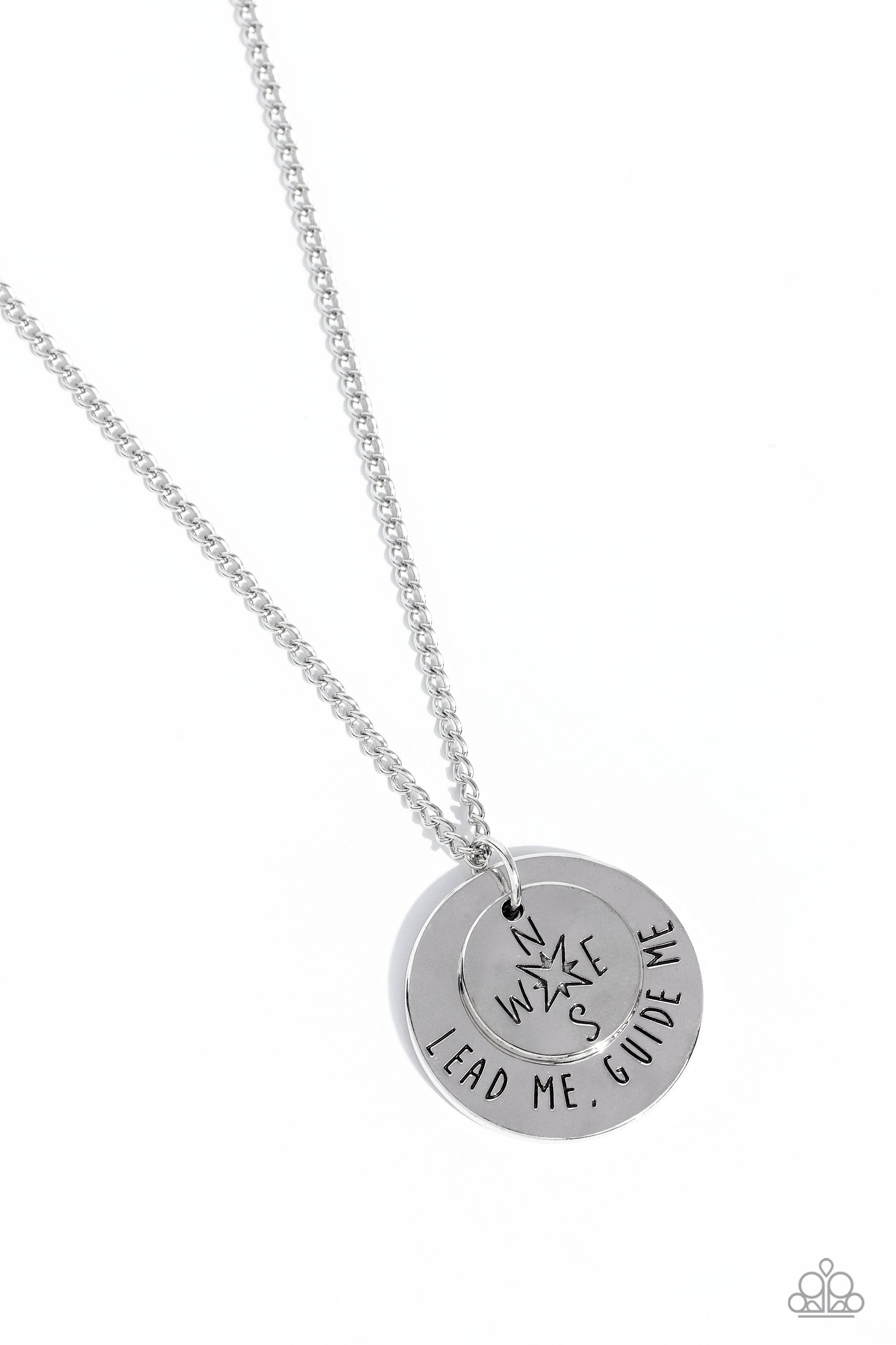 Two varying sizes of interconnected silver discs brushed in an antiqued grit swing below a classic silver chain. The oversized disc features the phrase "Lead Me, Guide Me" as the font curves up around the upper disc. The smaller, uppermost disc is stamped with a simple compass design, following its inspirational motif. Features an adjustable clasp closure.