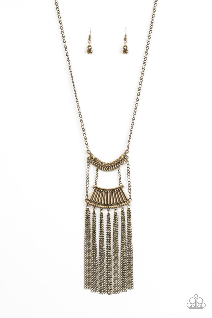 Encrusted in glittery aurum rhinestones, a bowing brass pendant attaches to an ornate brass frame, creating a bold pendant. Infused with an elongated brass chain, the tribal inspired pendant gives way to a shimmery brass fringe for a fierce finish. Features an adjustable clasp closure.