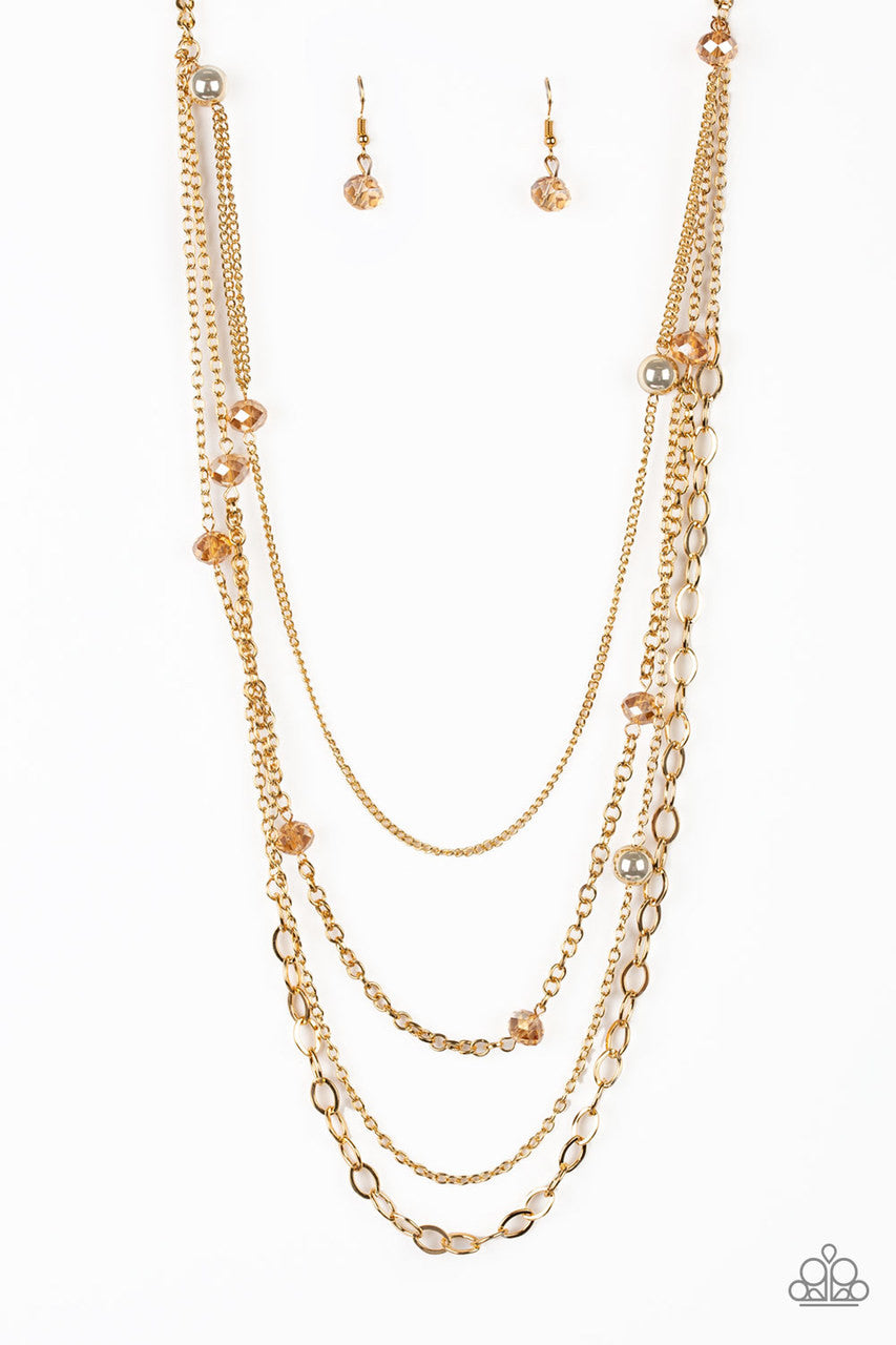 Golden crystal-like beads and shimmery gold beads trickle along mismatched gold chains, creating refined layers down the chest. Features an adjustable clasp closure.