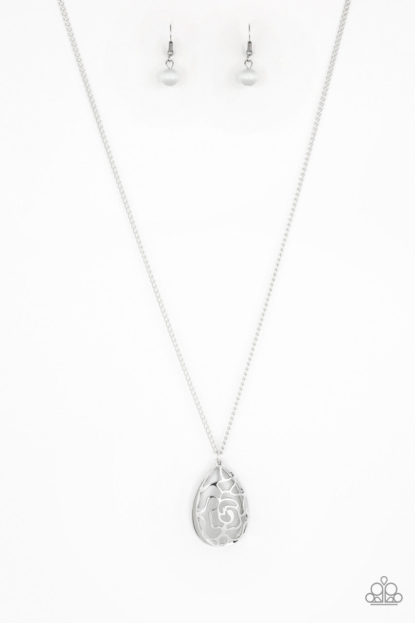 Stenciled in a whimsical floral pattern, an airy silver teardrop frame overlaps a glowing white cat's eye stone, creating a colorful pendant at the bottom of a lengthened silver chain. Features an adjustable clasp closure.