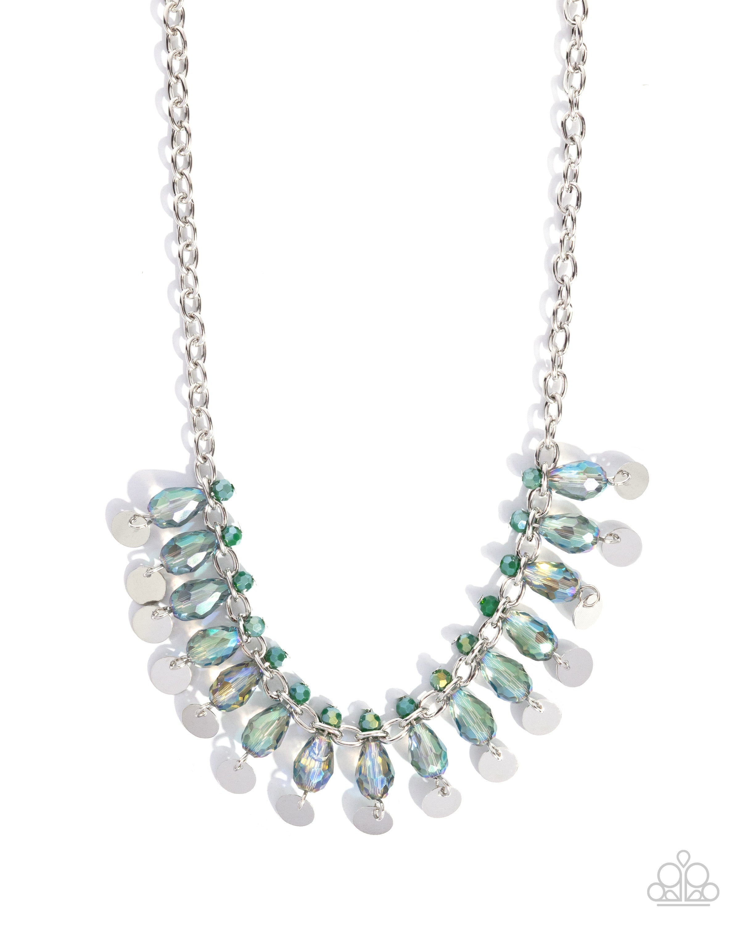 Threaded through the center of a silver cable chain, a collection of dainty, faceted green beads tops UV-shimmery green teardrop beads that give way to glistening silver discs for a flashy, fashionable display. Features an adjustable clasp closure.