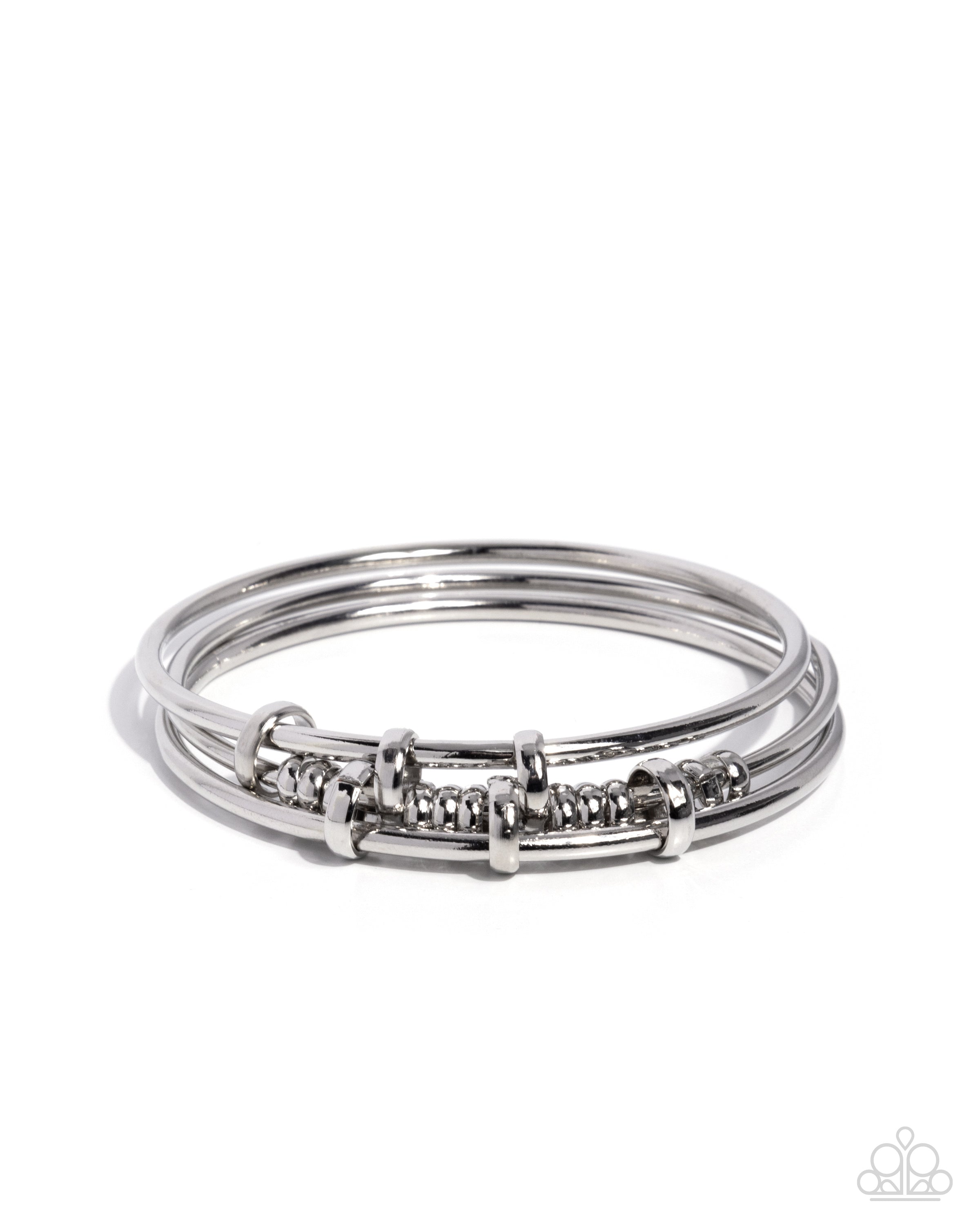 Infused in sections of smooth silver rings in varying sizes, sleek silver bangles stylishly stack up the wrist for a standout look.