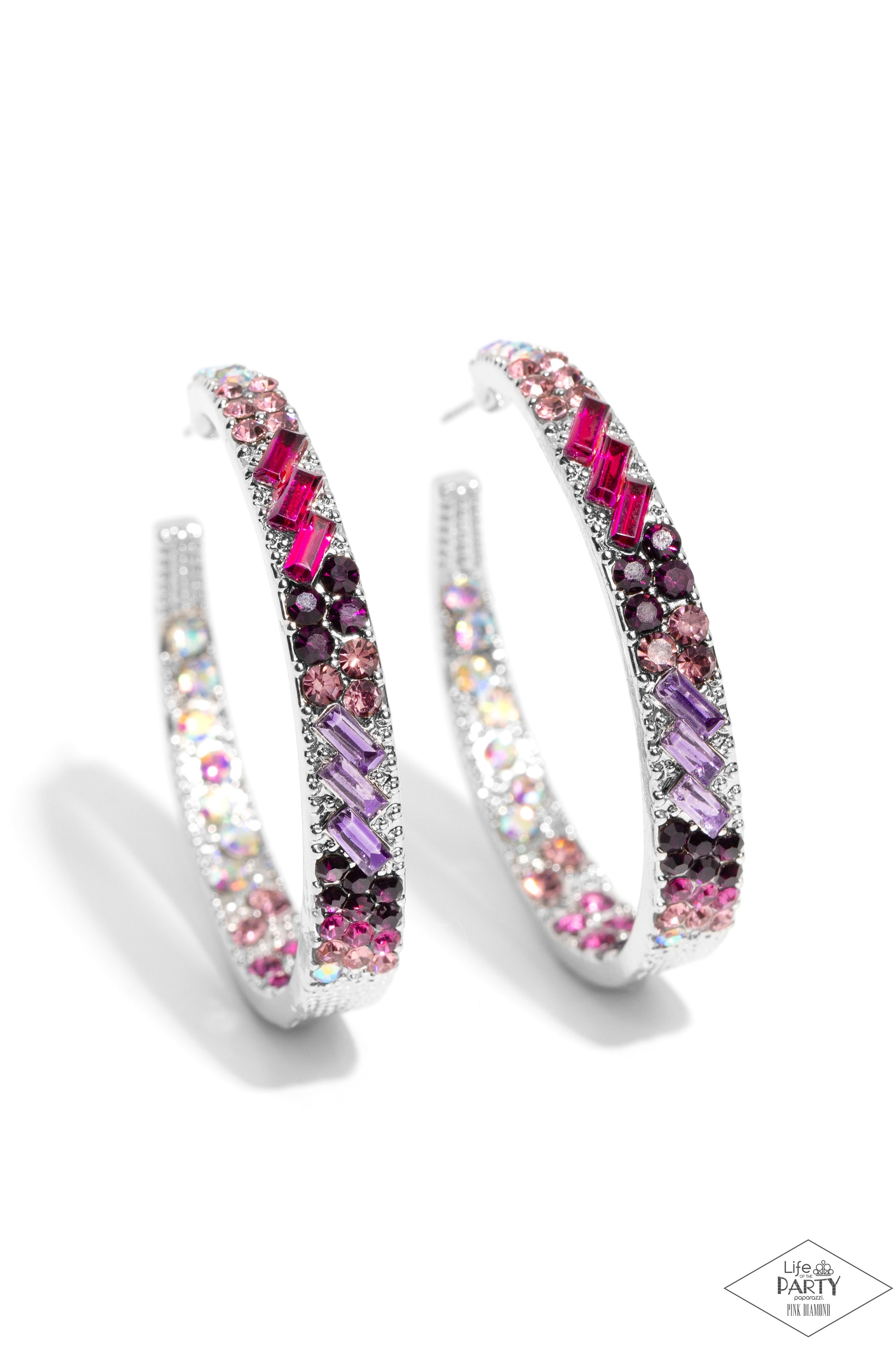 The front facing surface of a chunky silver hoop is dipped in brilliantly sparkling iridescent and multicolored rhinestones while light-catching texture wraps around the back. The interior of the hoop features the opposite pattern, creating the illusion of a full hoop of blinding rhinestones. Earring attaches to a standard post fitting. Hoop measures 1 3/4" in diameter. Due to its prismatic palette, color may vary.
