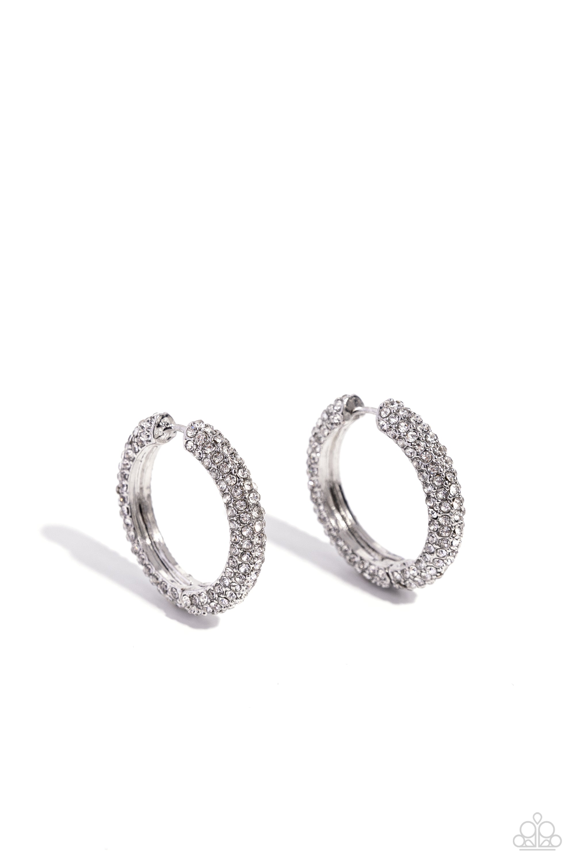 Featuring rows of dazzling white rhinestones, a glittery pair of silver hoops curl around the ear for a spellbinding statement. Earring attaches to a standard post fitting. Hoop measures approximately 3/4" in diameter.
