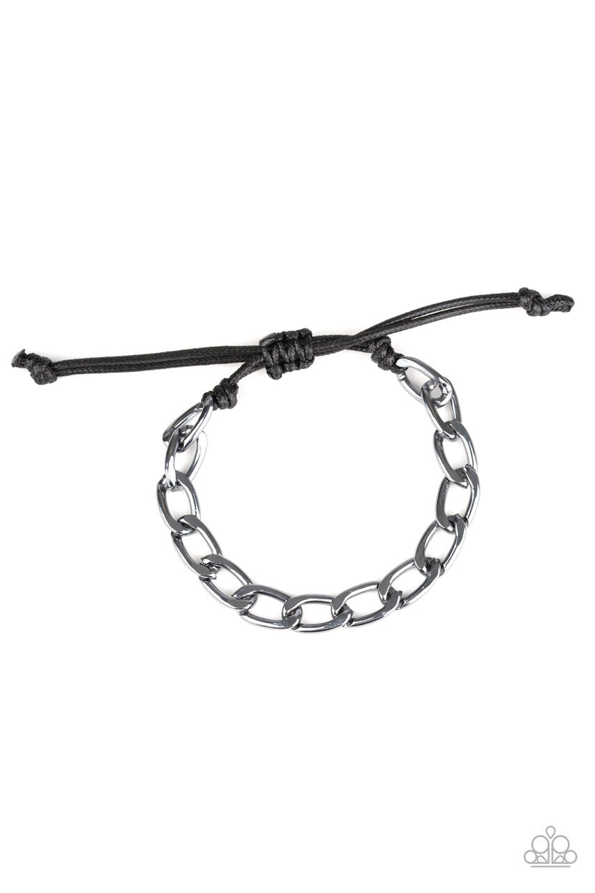 Shiny black cording knots around the ends of a gunmetal beveled cable chain that is wrapped across the top of the wrist for a versatile look. Features an adjustable sliding knot closure.