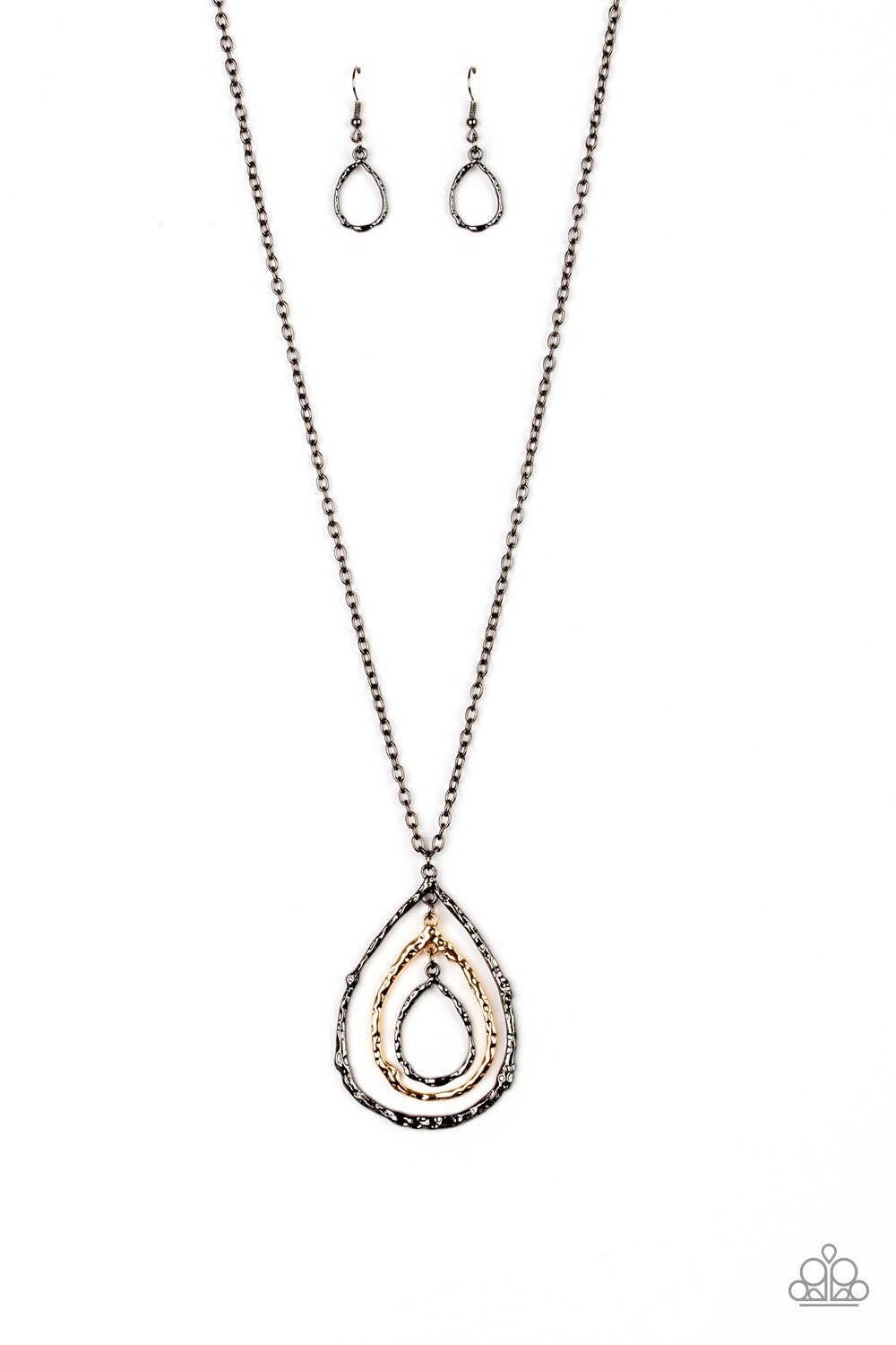 Brushed in an antiqued shimmer, delicately hammered copper, gold, and gunmetal teardrop silhouettes swing from the bottom of a lengthened gunmetal chain for a rustic look. Features an adjustable clasp closure.
