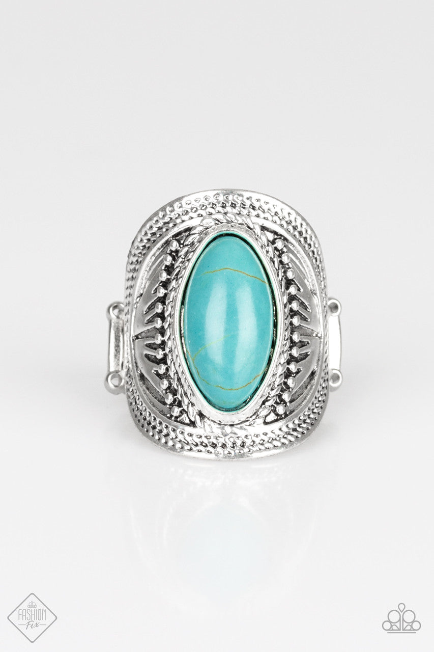 Chiseled in a tranquil oval shape, a refreshing turquoise stone is pressed into the center of a thick silver band rippling with rustic and studded textures for a seasonal flair. Features a stretchy band for a flexible fit.