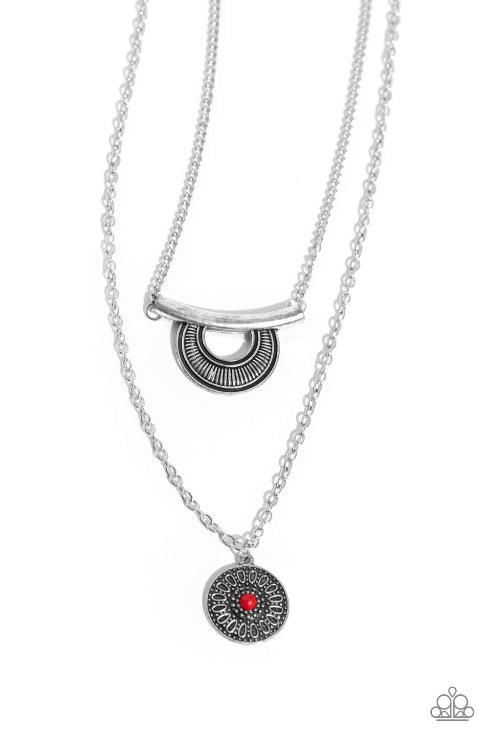 Radiating with linear patterns, a shimmery silver frame swings from the uppermost chain above a silver disc radiating with floral detail. A dainty red bead dots the center of the lowermost pendant for a colorful finish. Features an adjustable clasp closure.