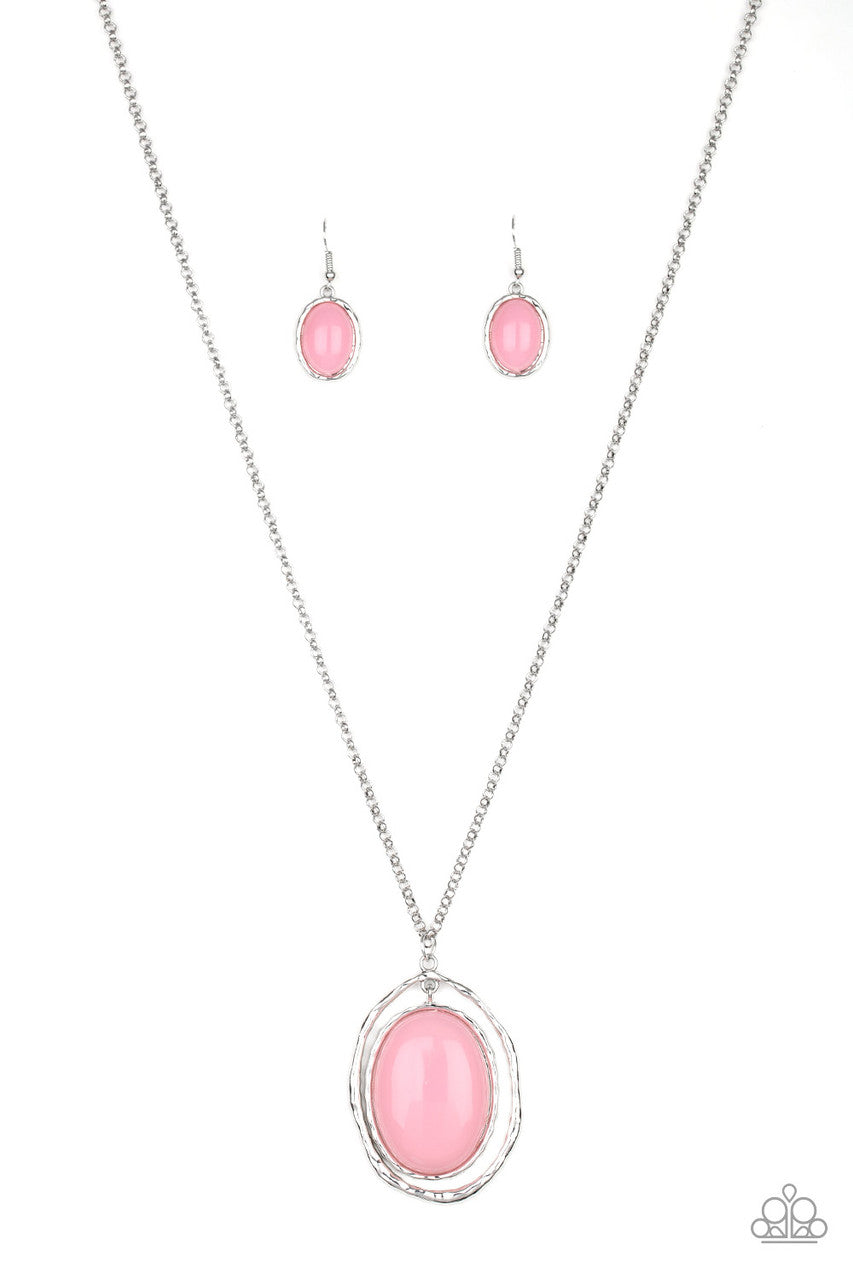 A dewy pink bead is pressed into the center of a stacked silver frame radiating with shimmery hammered textures. The oversized pendant swings from the bottom of a lengthened silver chain, adding a whimsical pop of a color to any outfit. Features an adjustable clasp closure.