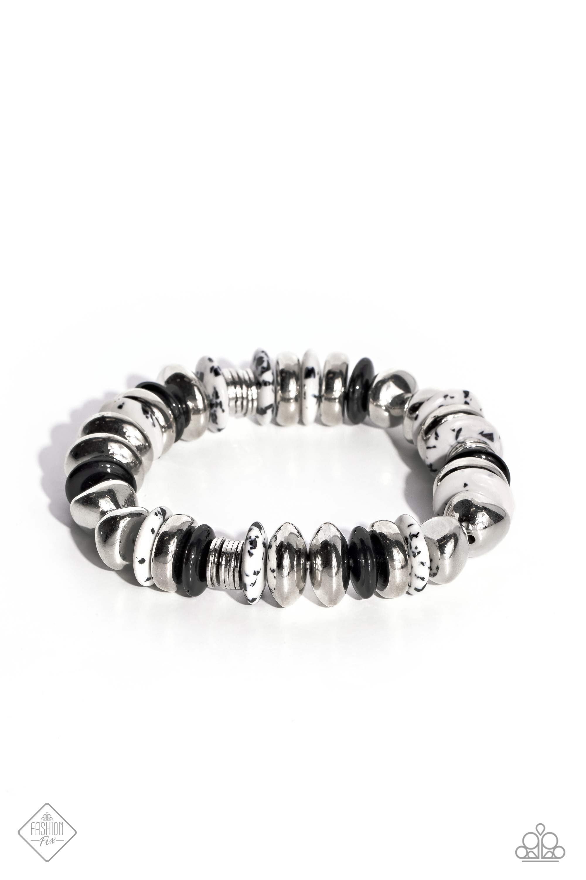 Featuring a black-dotted pattern, abstract white stone discs, black acrylic discs, and various silver discs and accents are threaded along an elastic stretchy band for a high-end, artisanal-inspired look. As the stone elements in this piece are natural, some color variation is normal.