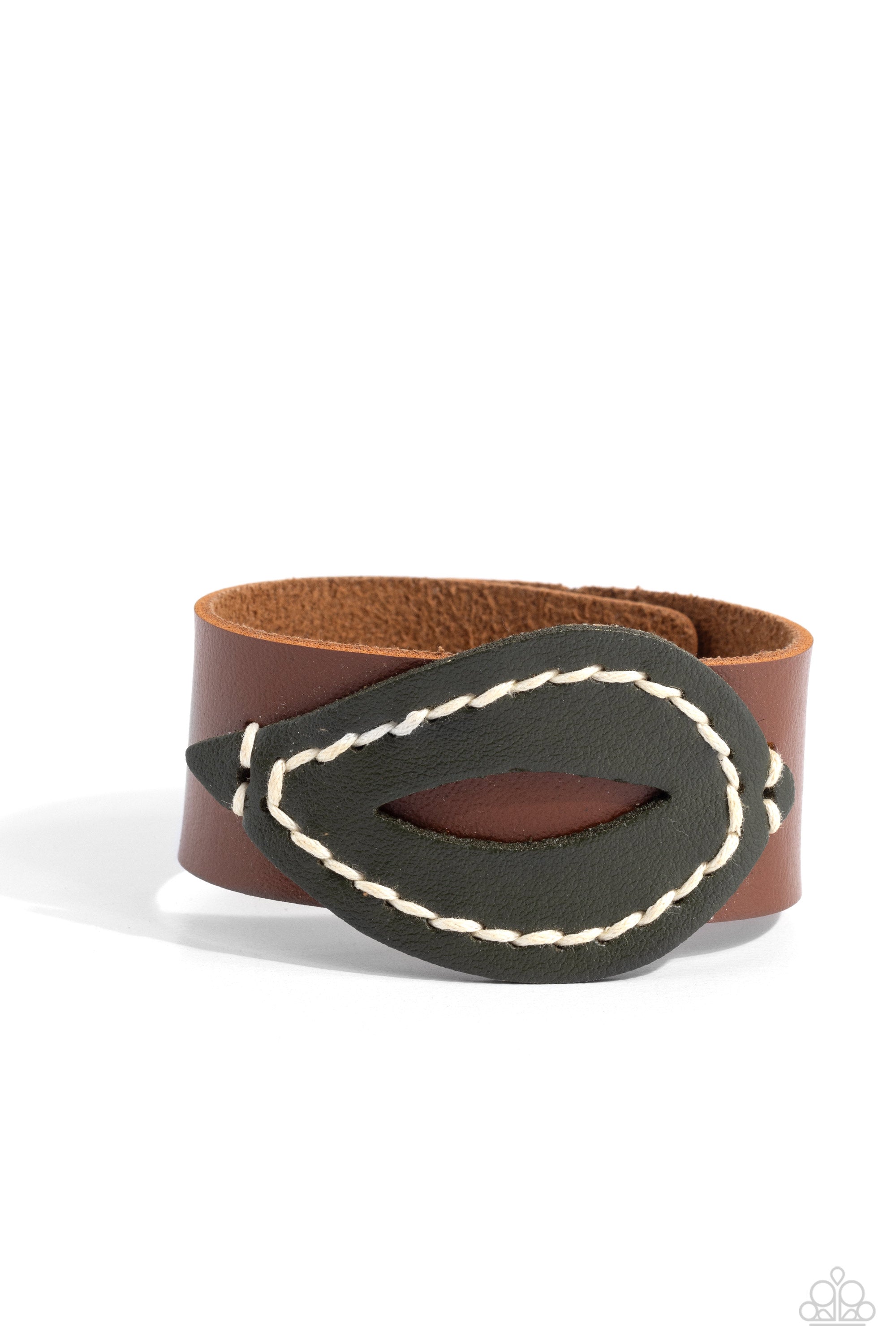 A leathery Olive Branch leaf frame is stitched in place across the front of a brown leather band, resulting in a seasonal centerpiece around the wrist. Features an adjustable snap closure.