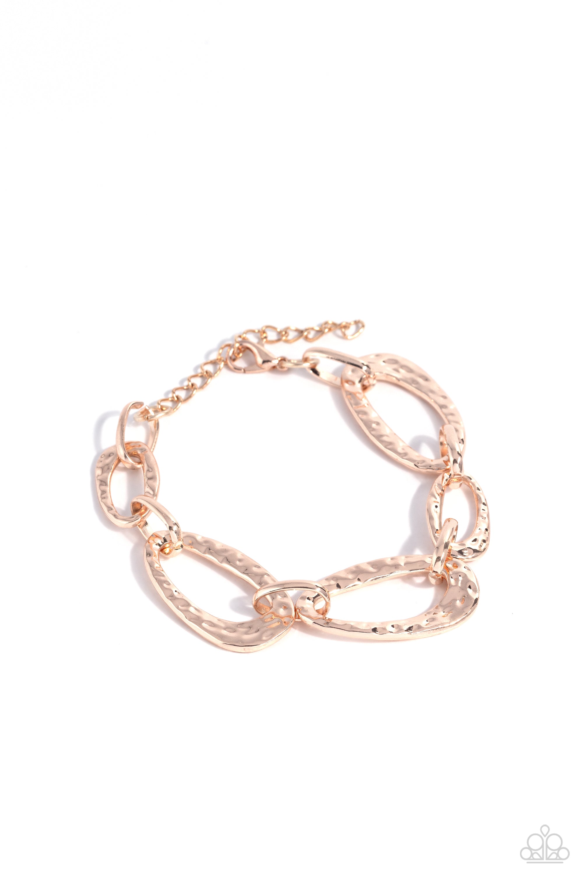 A hammered collection of asymmetrical rose gold ovals delicately links with rose gold fittings around the wrist, resulting in a monochromatic statement piece. Features an adjustable clasp closure.