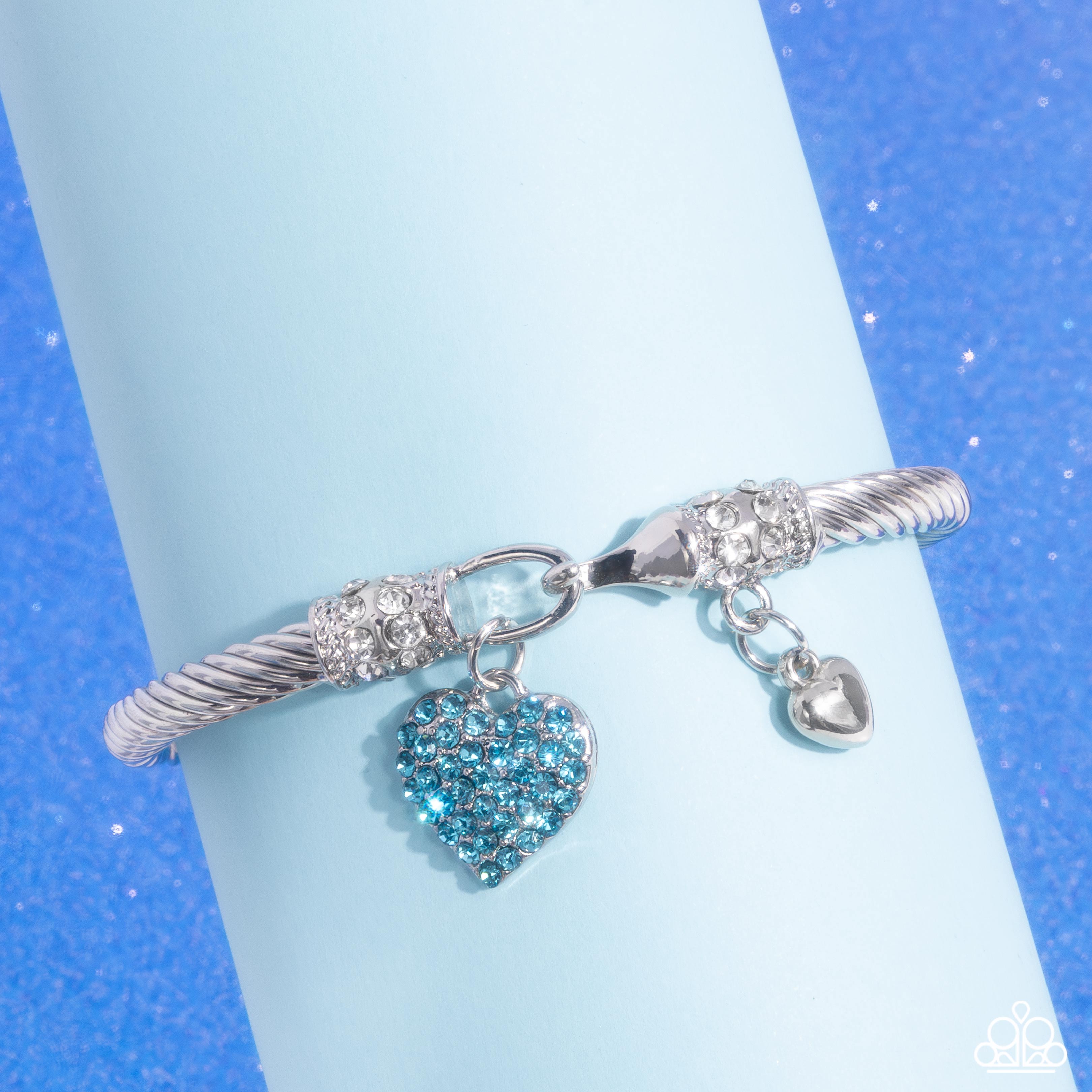 Rippling with wavy textures, a glistening band of silver coils and twists along the wrist for a timeless display. An aquamarine rhinestone-encrusted silver heart swings from one end of the display while a dainty, solitaire silver heart swings from the other for a beautifully balanced look. Textured silver and rows of white rhinestones adorn the closures for additional refinement and glitz. Features a hook and eye closure.
