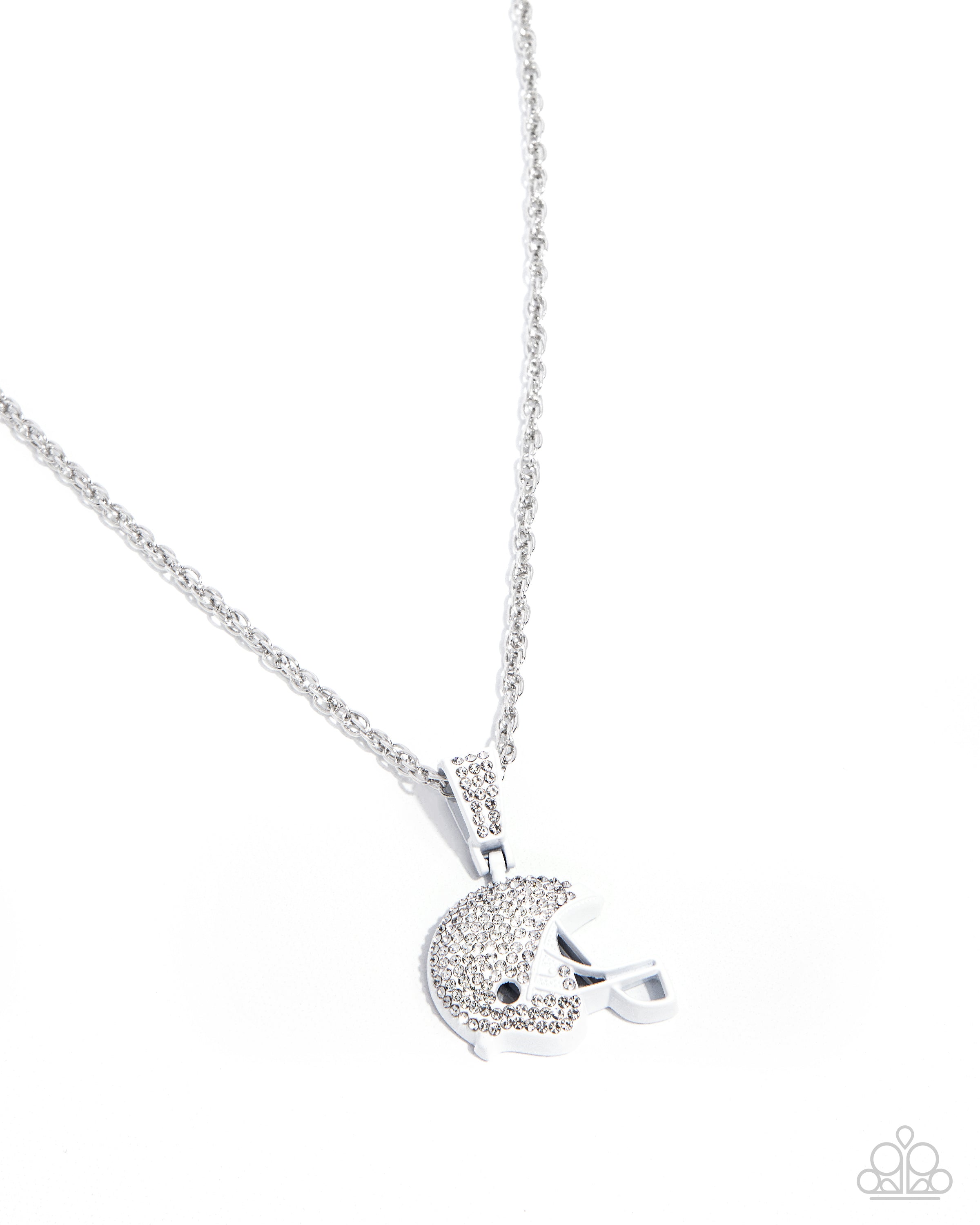 Featuring an explosion of glistening white rhinestones, a white-painted bail clasp connected to a white-painted football helmet also embellished in white rhinestones glides along a classic silver chain for a shimmery, sporty look. Features an adjustable clasp closure.