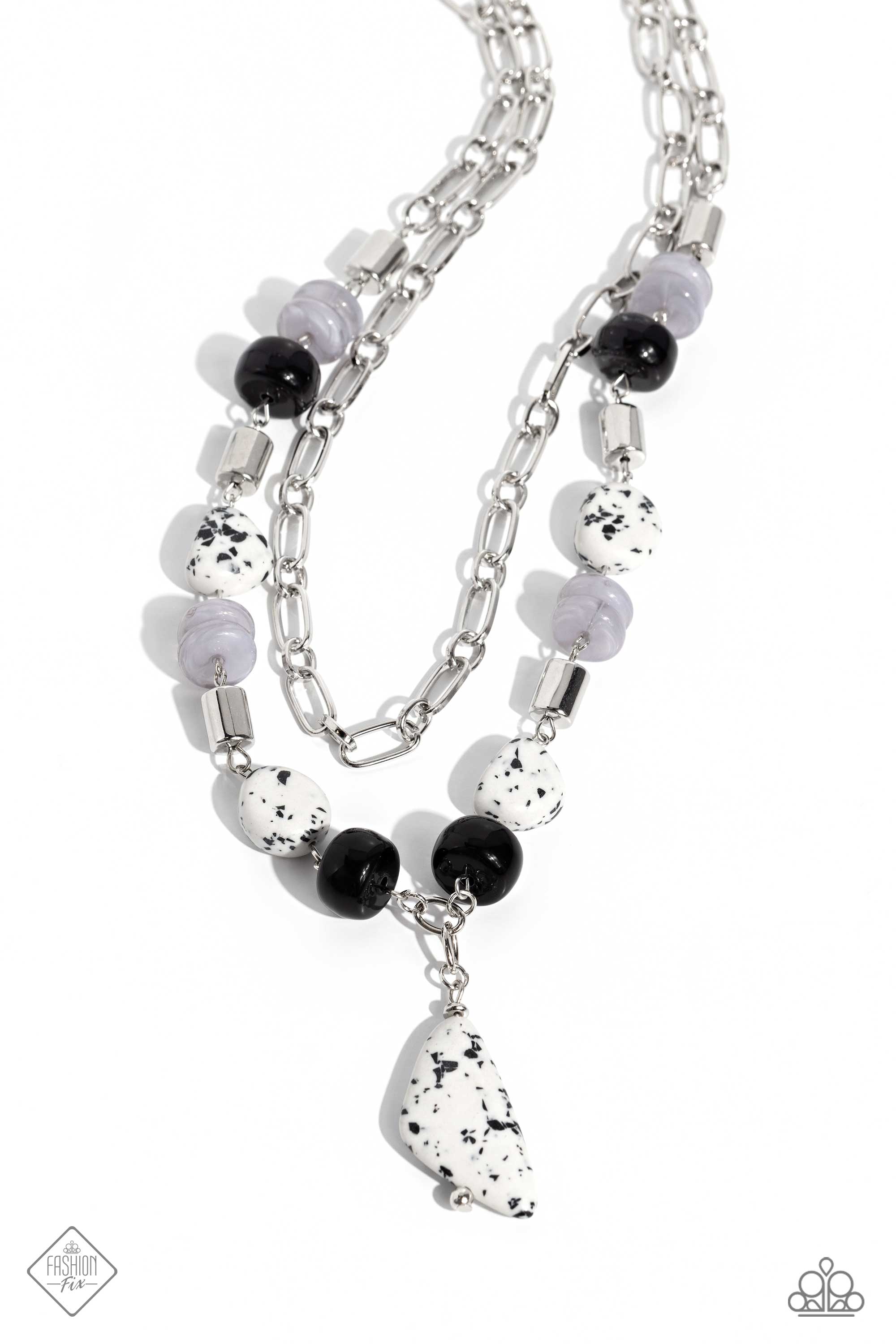 Infused with a silver paperclip chain, Ultimate Gray discs, silver accents, black acrylic beads, and white stones spotted with a black motif trickle along an elongated silver paperclip chain, creating a high-end display of earthy layers. An asymmetrical white stone triangle, also spotted in black flecks, dangles from the abstract display for a hint of handcrafted detail. Features an adjustable clasp closure. As the stone elements in this piece are natural, some color variation is normal.