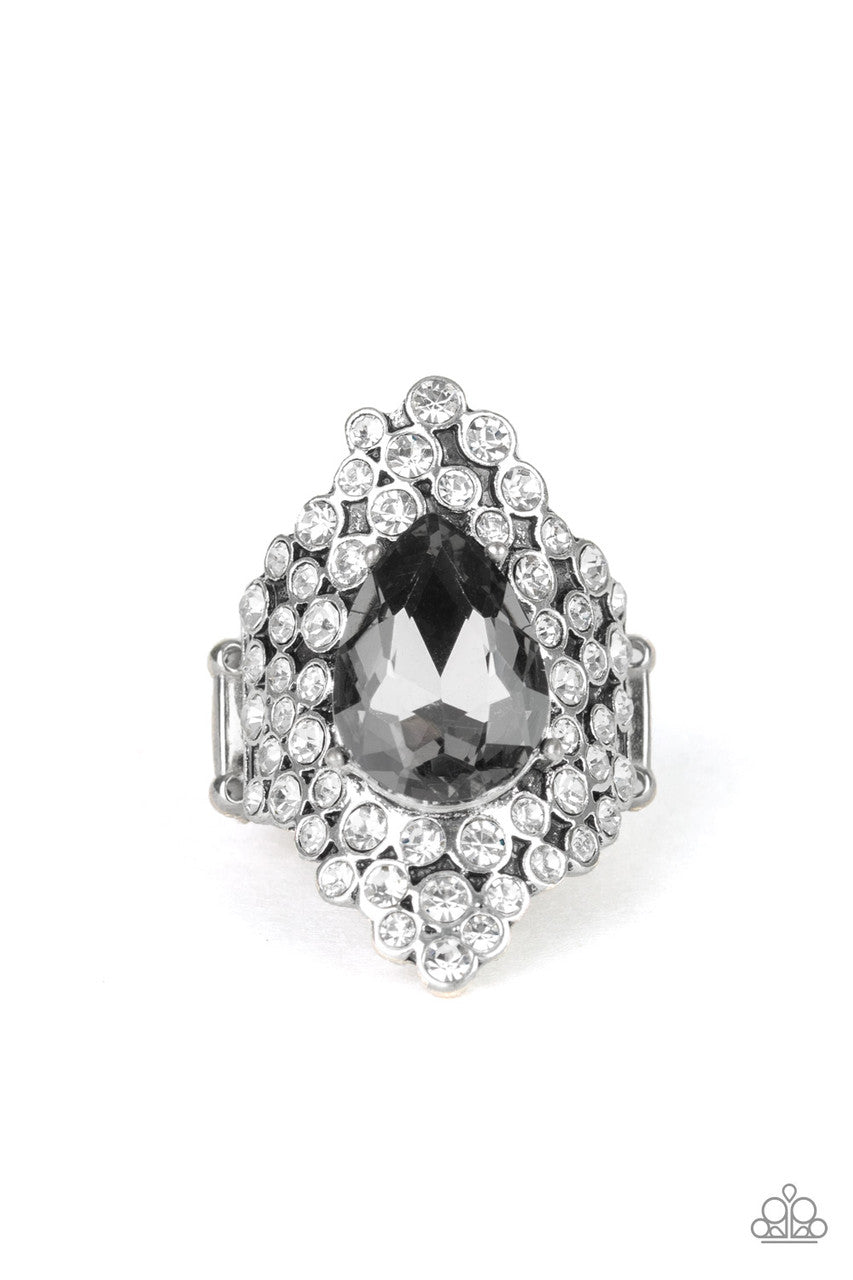 Featuring a regal teardrop cut, a smoky gem is pressed into the center of a sparkling backdrop of glassy white rhinestones, creating a blinding centerpiece atop the finger. Features a stretchy band for a flexible fit.