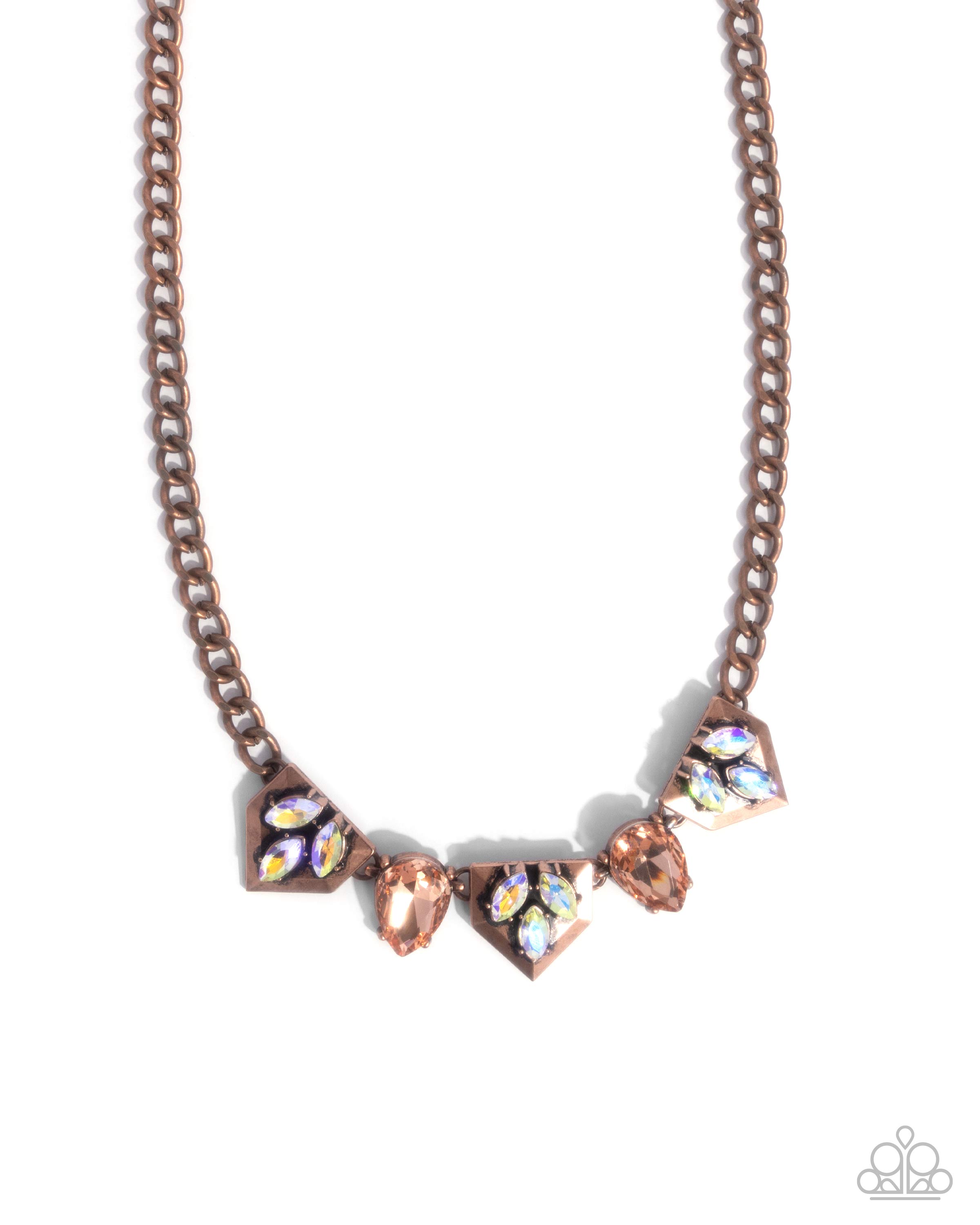 Featuring a chunky copper curb chain, a trio of geometric pendants and oversized peach gem teardrops rest below the neckline. Each copper triangle showcases clusters of marquise-cut iridescent rhinestones that create a striking contrast against the metal. Features an adjustable clasp closure.