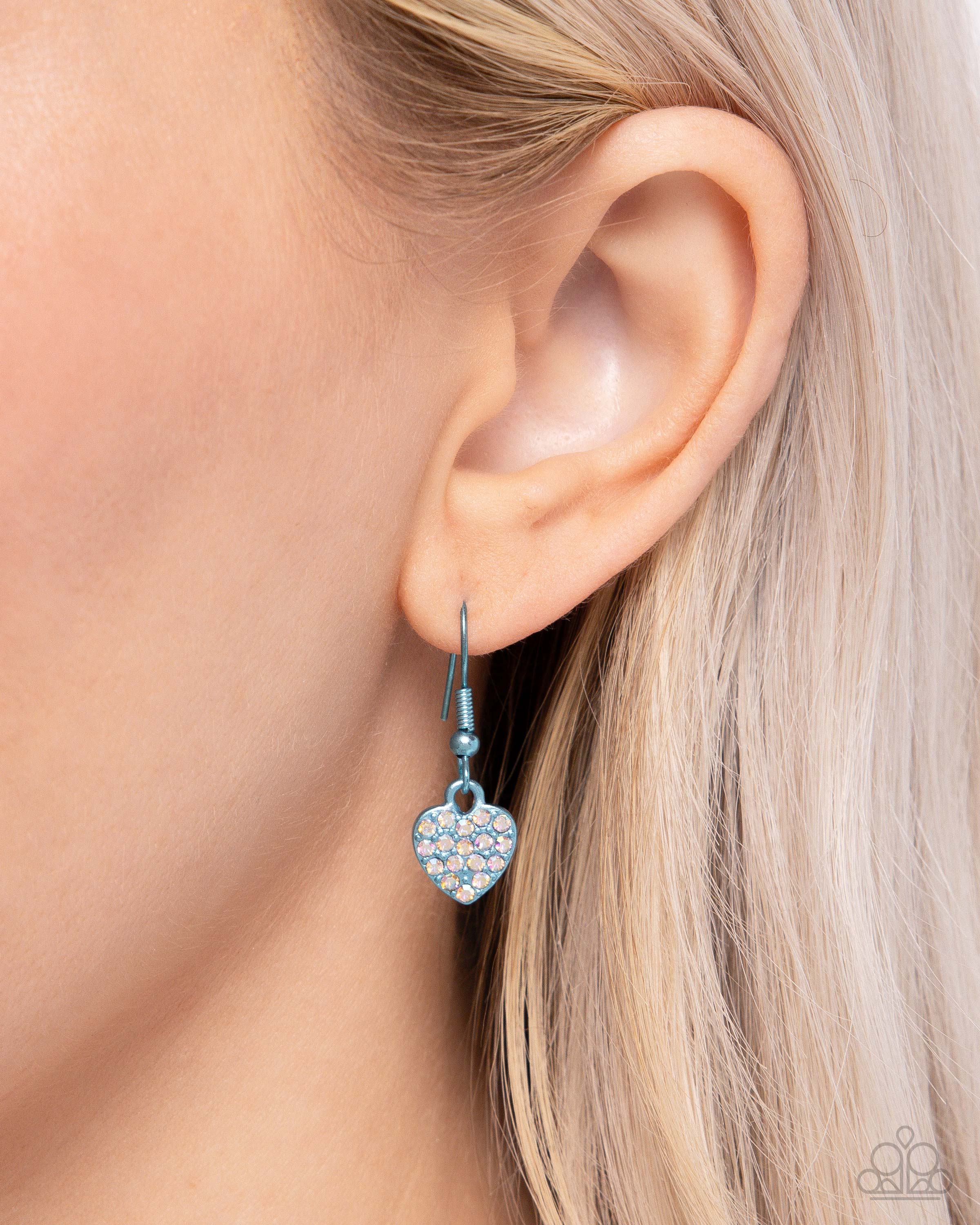 Set in metallic blue square fittings, a collection of dainty iridescent rhinestones loop around the neckline. Metallic blue hearts, also embellished with iridescent rhinestones, haphazardly interrupt the shimmery strand for a romantic finish. Features an adjustable clasp closure. Due to its prismatic palette, color may vary.