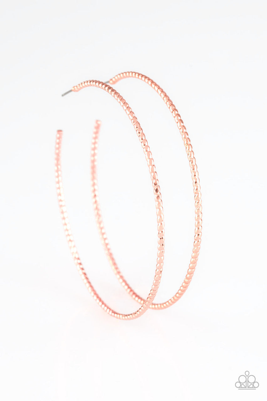 Rippling with diamond-cut shimmer, a shiny copper hoop curls around the ear in a casual fashion. Earring attaches to a standard post fitting. Hoop measures 3" in diameter.