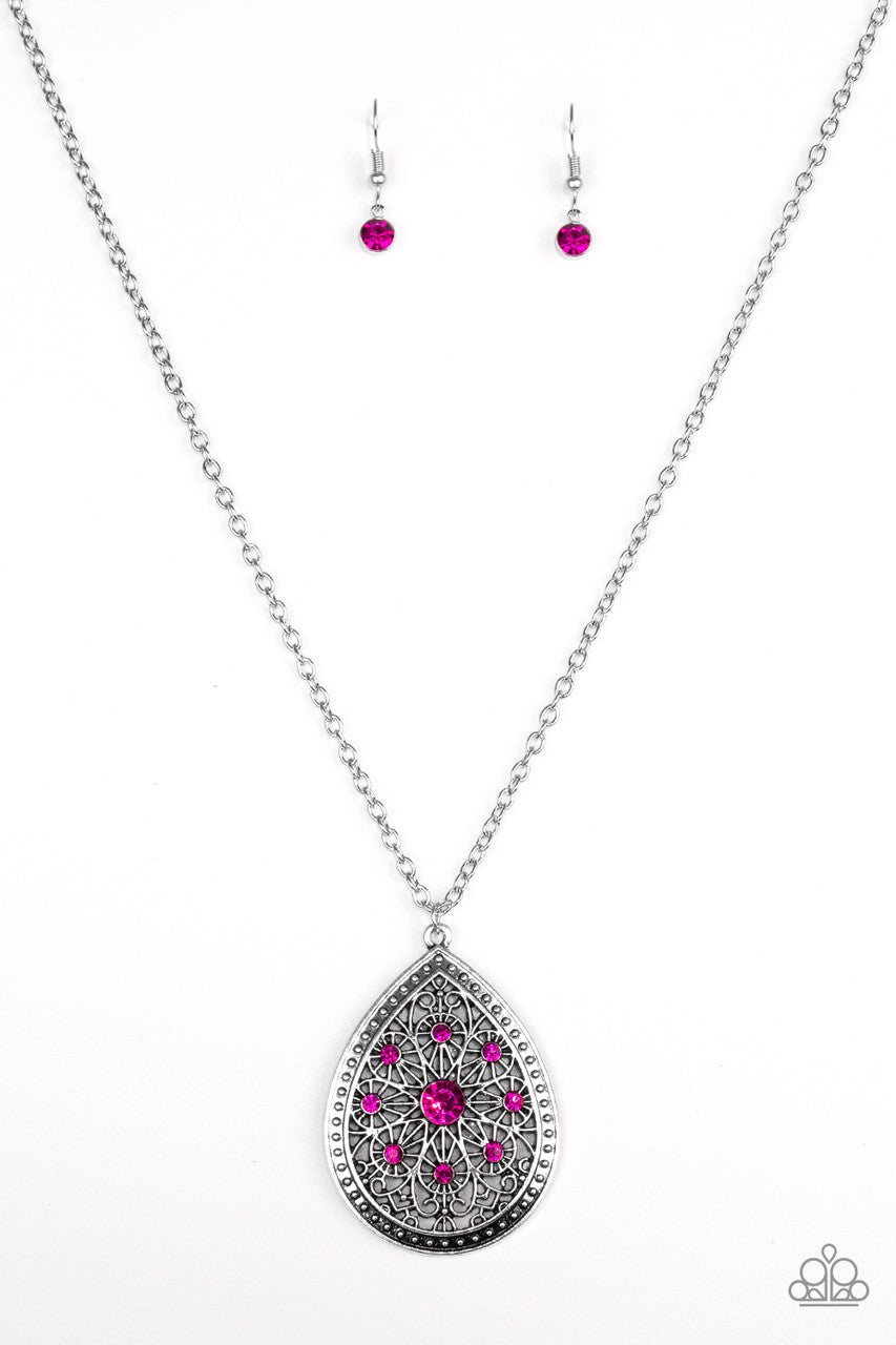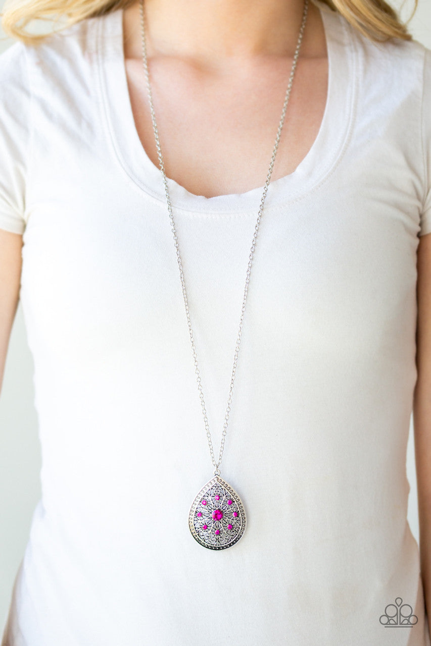 A dramatic teardrop pendant swings from the bottom of an elongated silver chain, elegantly slimming the torso. Glittery pink rhinestones are sprinkled along the pendant as silver filigree dances across the center, creating a regal floral pattern. Features an adjustable clasp closure.