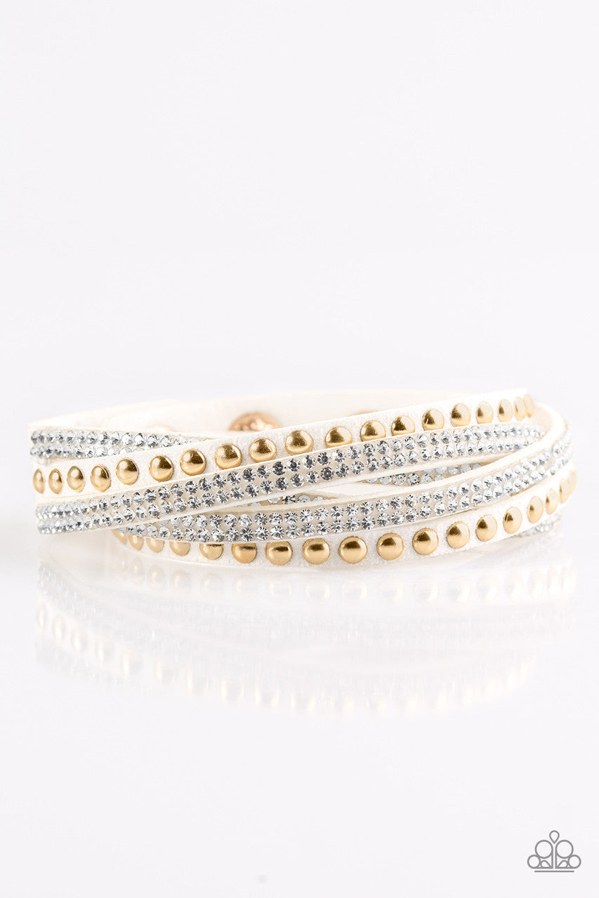 Rows of glassy white rhinestones and glistening gold studs are pressed along three strands of white suede for a sassy look. The elongated band allows for a trendy double wrap design. Features an adjustable snap closure.