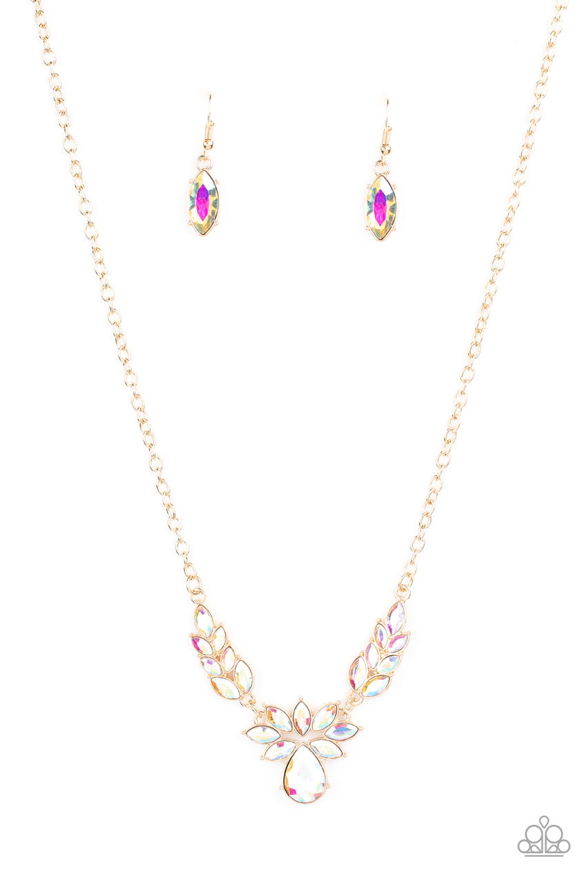 Dotted with marquise style metallic iridescent rhinestones, leafy gold frames delicately connect into a vintage inspired pendant below the collar. An oversized metallic iridescent teardrop crowns the golden centerpiece for an eye-catching finish. Features an adjustable clasp closure.