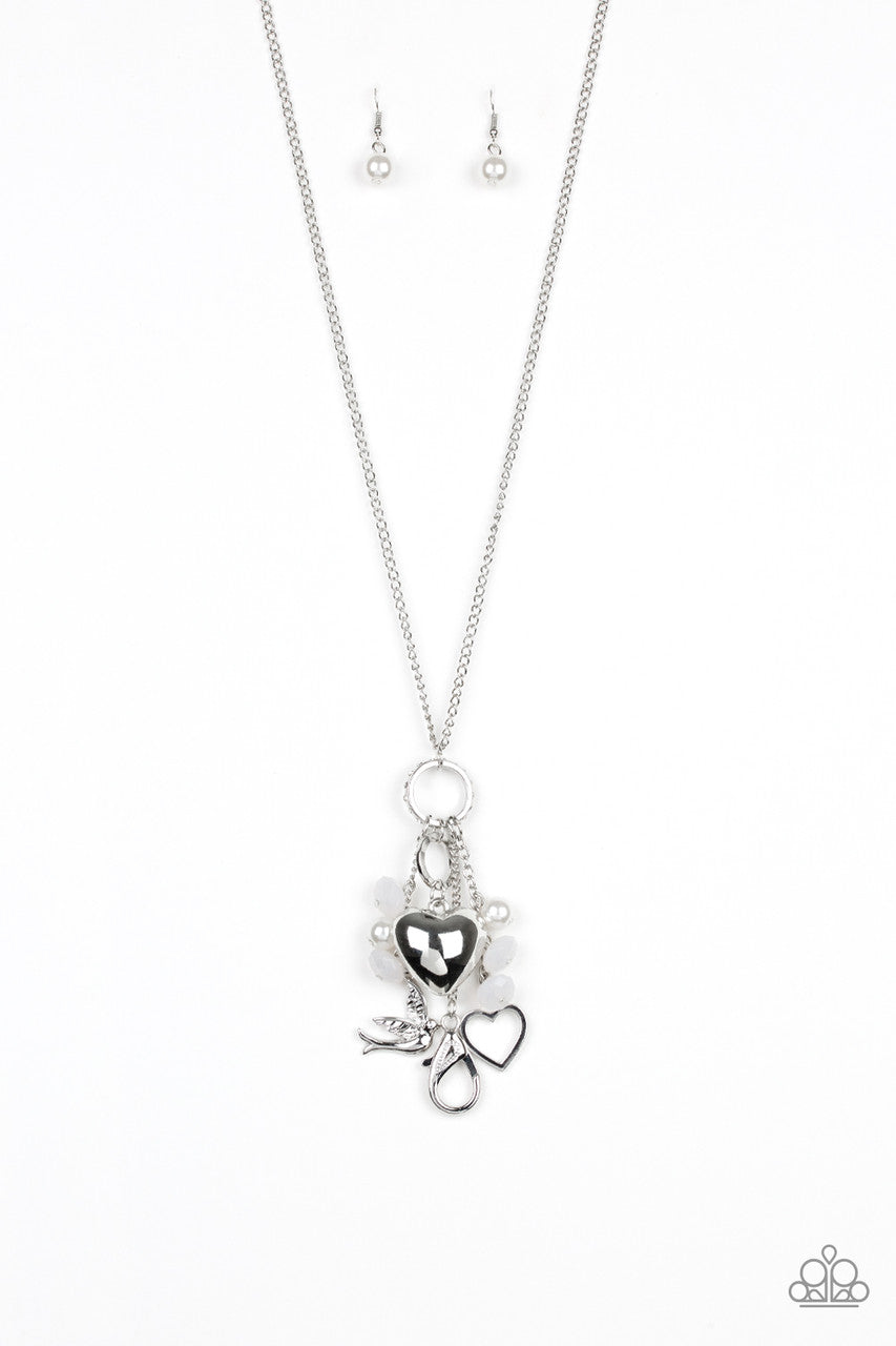 A silver bird charm, silver heart charms, and collection of white pearls and opaque crystal-like beads swing from the bottom of a lengthened silver chain for whimsically clustered look. A lobster clasp hangs from the bottom of the design to allow a name badge or other item to be attached. Features an adjustable clasp closure.