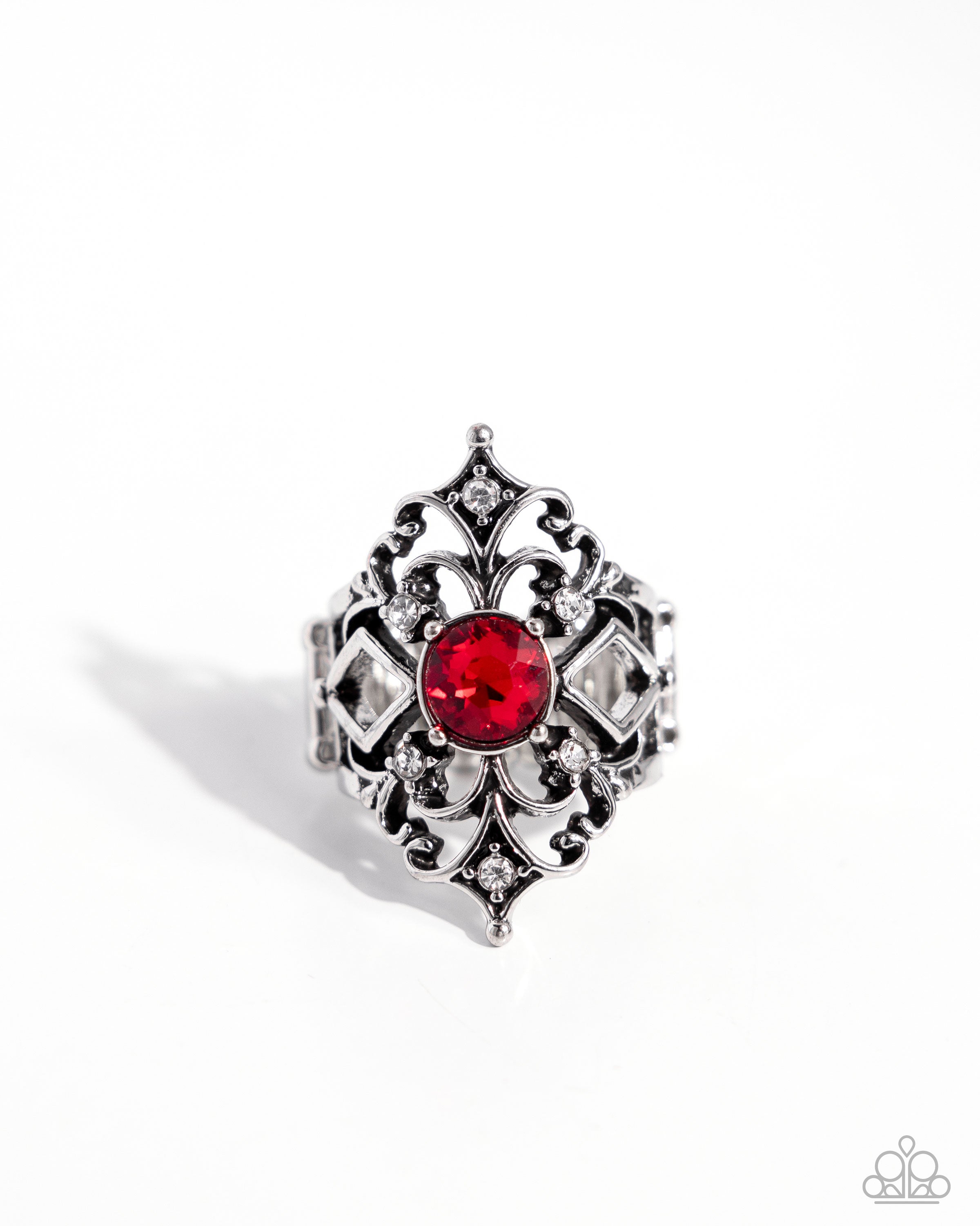 An ornate antiqued silver frame dotted with dainty white rhinestones, provides a majestic backdrop for a round red rhinestone that glistens at the center, creating nostalgic allure atop the finger. Features a stretchy band for a flexible fit.
