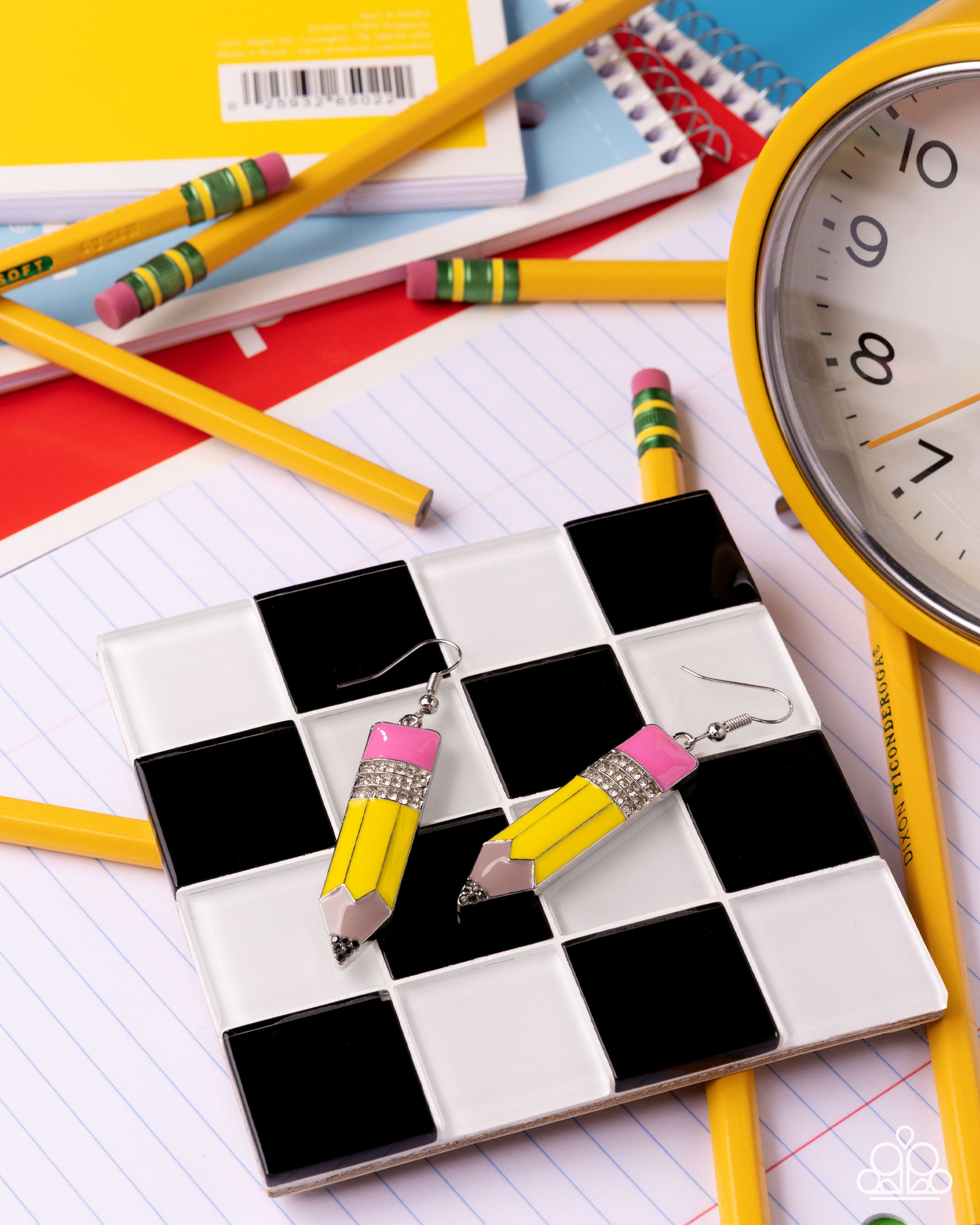 Featuring a Desert Rose eraser, row after row of white rhinestones, a yellow pencil, and a hematite rhinestone tip, a glistening silver pencil swings below the ear for a blingy back-to-school statement. Earring attaches to a standard fishhook fitting.