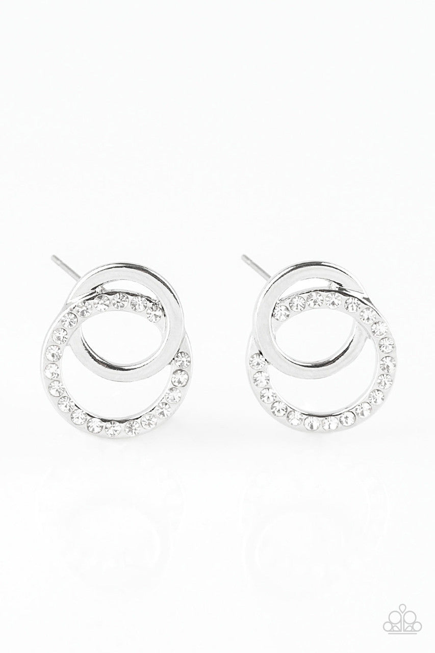 A glistening silver hoop interlocks with a white rhinestone encrusted hoop, creating a glamorous frame. Earring attaches to a standard post fitting.