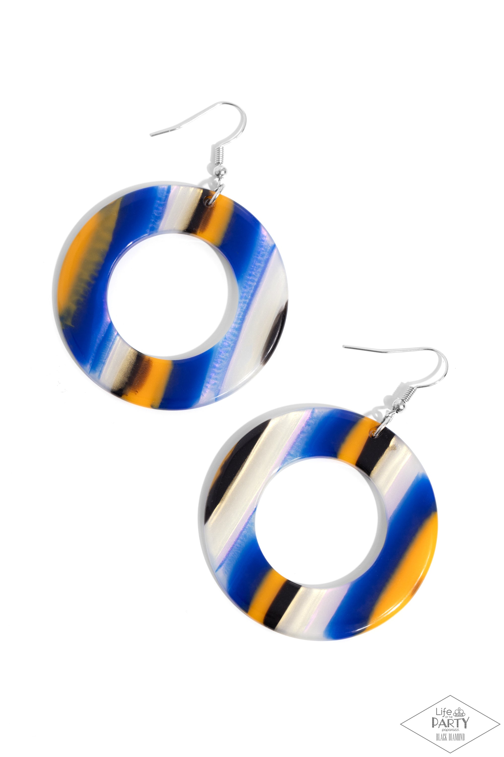 Streaked in black, blue, yellow, and iridescent accents, a colorful acrylic hoop swings from the ear for a retro look. Earring attaches to a standard fishhook fitting. Colors on individual earrings may vary.
