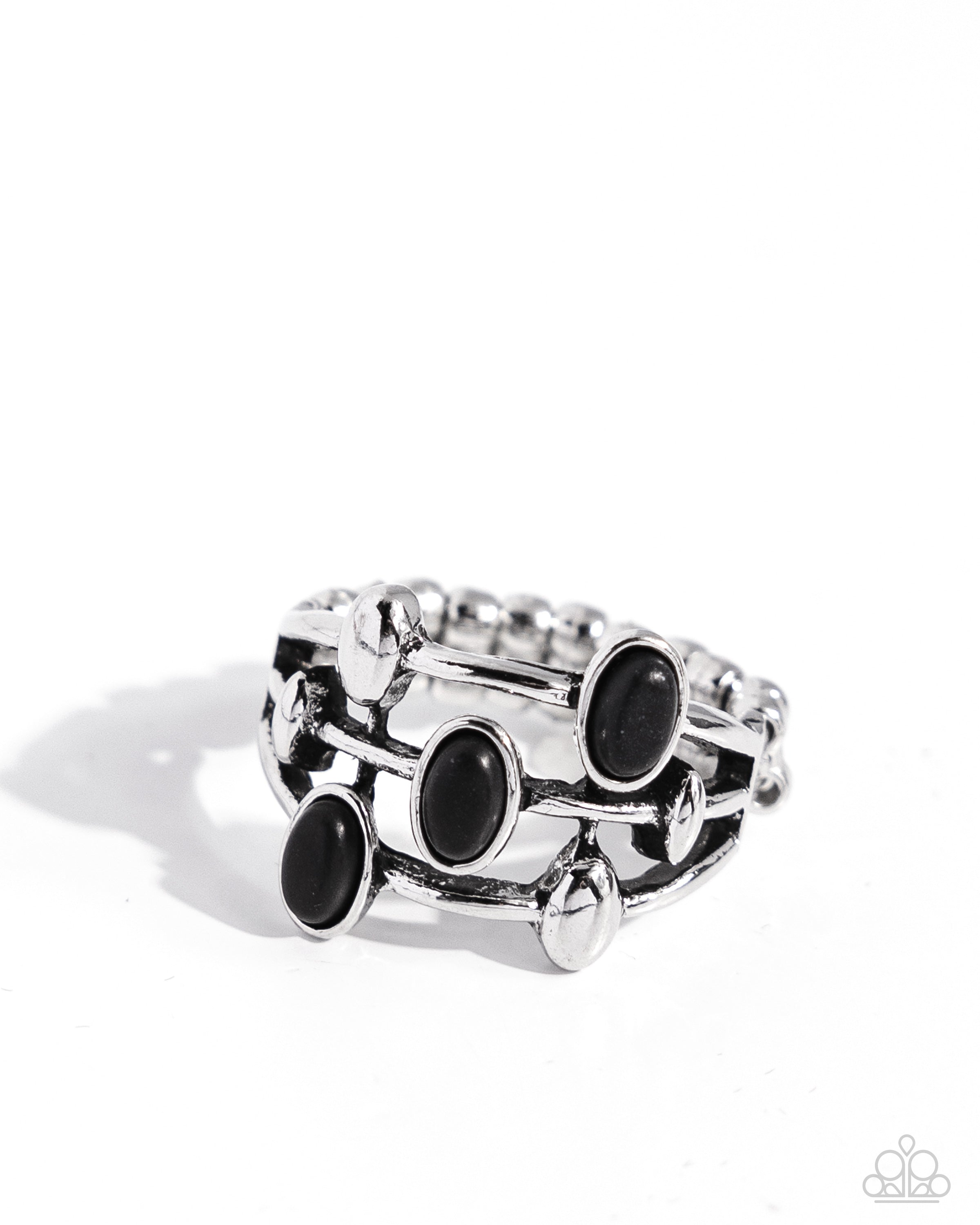 A trio of oval black stones haphazardly adorns layers of silver rows infused with silver ovals, coalescing into an earthy centerpiece. Features a dainty stretchy band for a flexible fit. As the stone elements in this piece are natural, some color variation is normal.