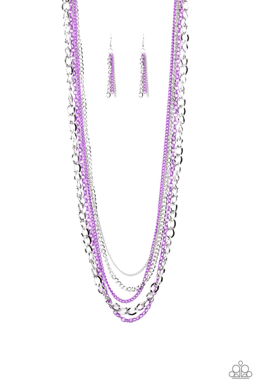 A collision of mismatched silver and vivacious purple chains layer down the chest for a colorful industrial flair. Features an adjustable clasp closure.