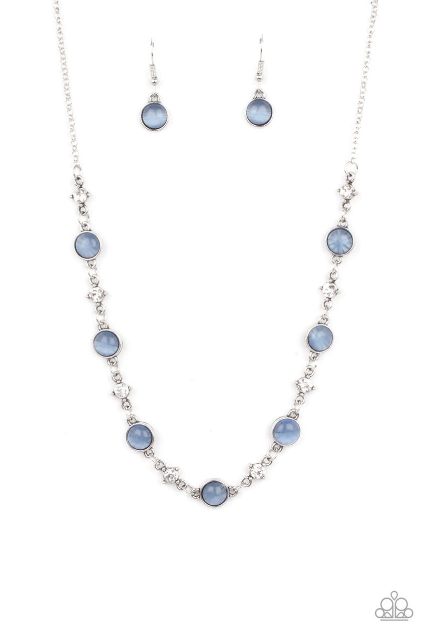 Encased in antiqued silver fittings, dainty white rhinestones and glowing Cerulean cat's eye stones delicately link below the collar for a timeless finish. Features an adjustable clasp closure.