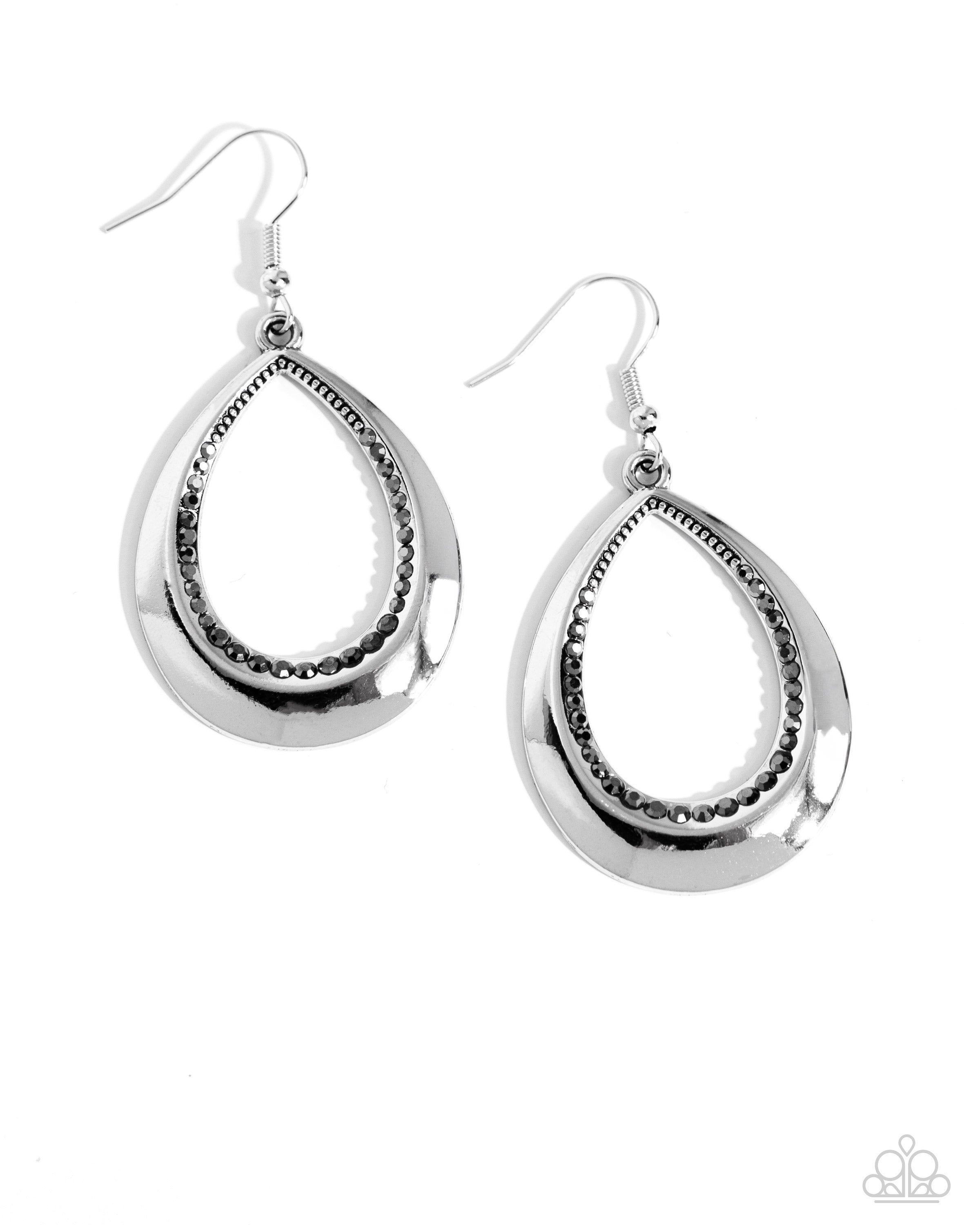 Dainty silver studs give way to an inner border of smoldering hematite rhinestones, highlighting the curve of the classic silver teardrop. Earring attaches to a standard fishhook fitting.