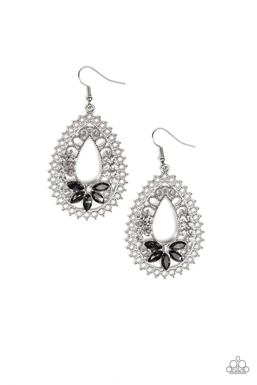 Studded filigree swirls into a frilly teardrop frame. Infused with glassy white rhinestones, smoky marquise-shaped rhinestones are pressed into a whimsical floral shape for a refined flair. Earring attaches to a standard fishhook fitting.