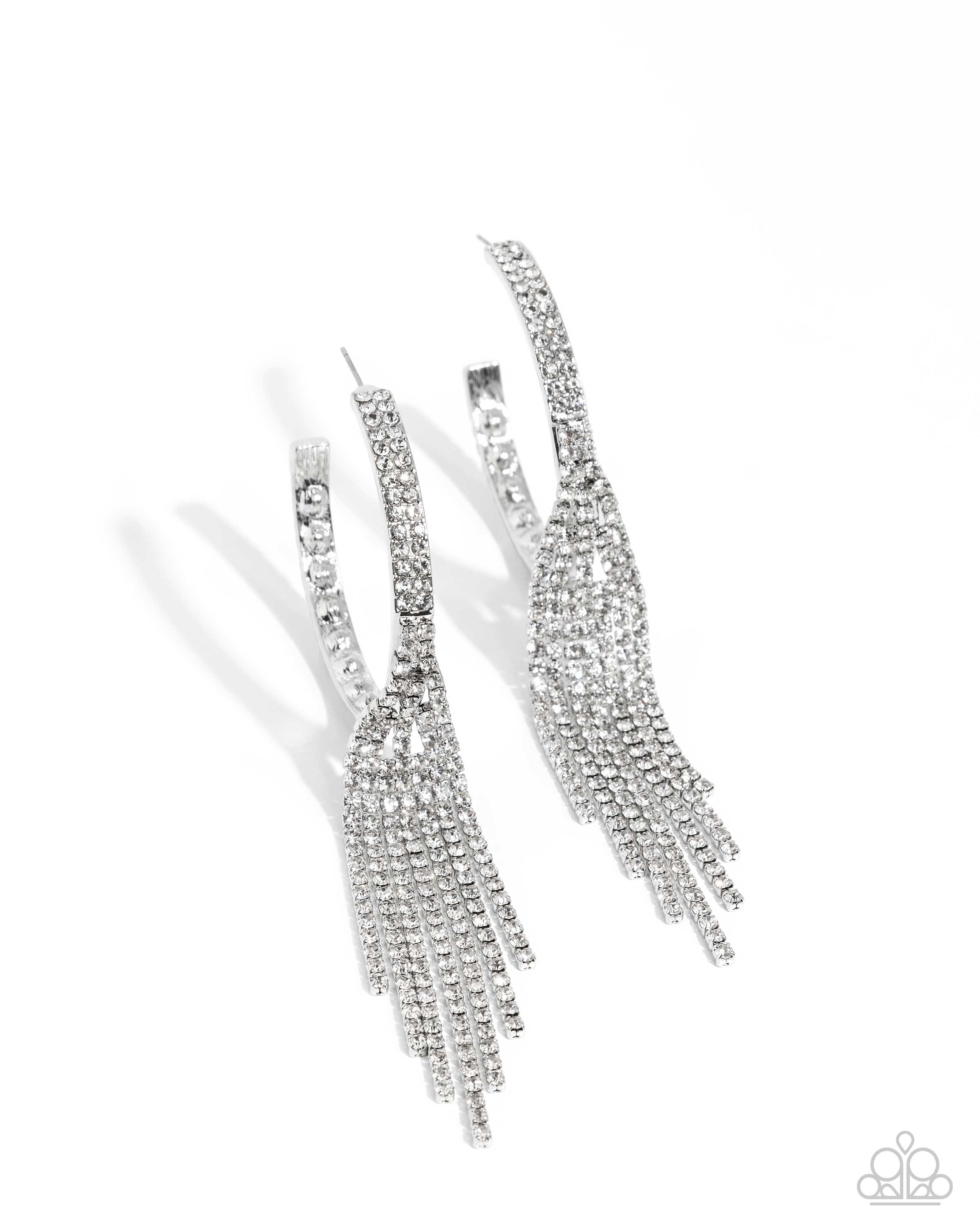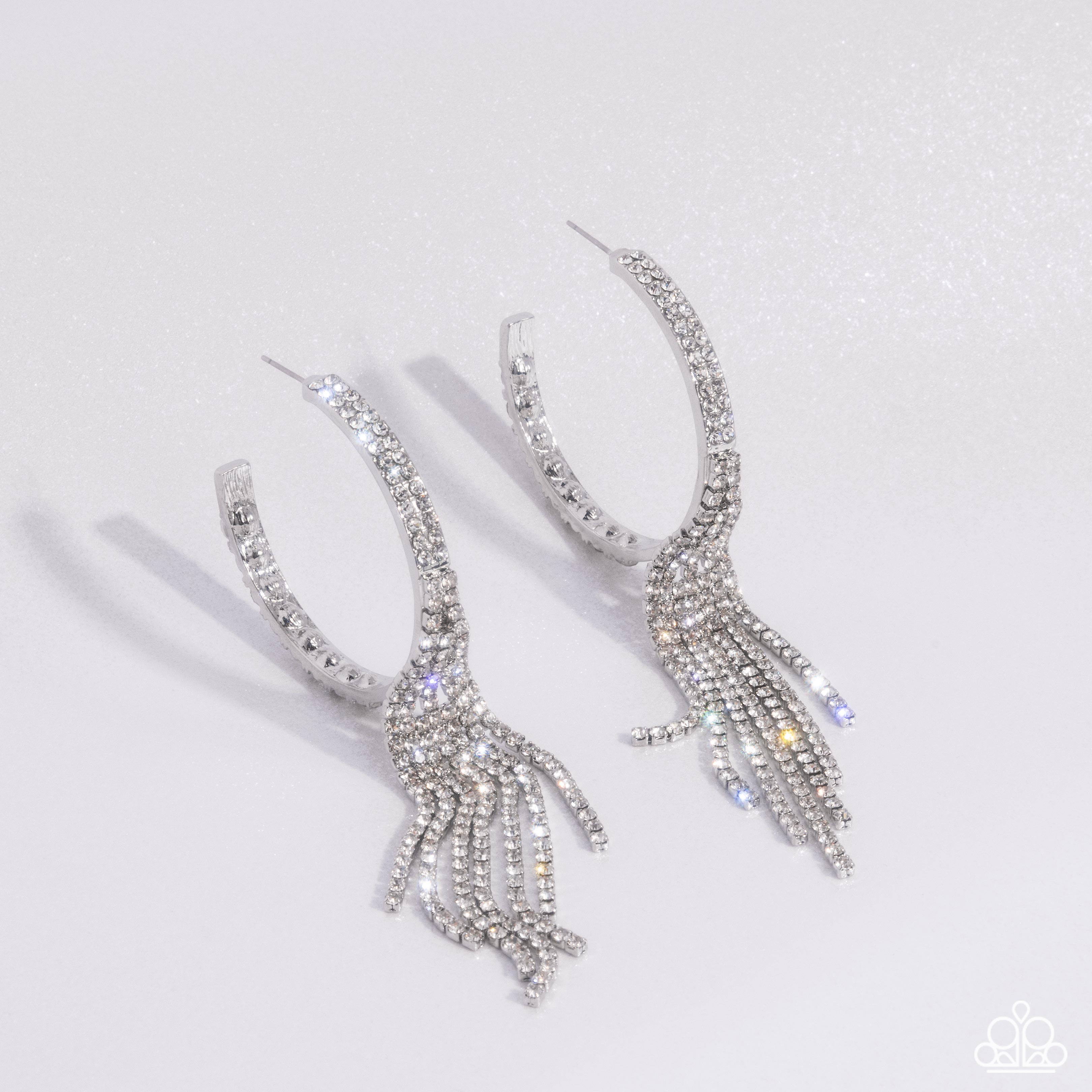 Set atop the front of a silver hoop, a doubled row of white rhinestones is embellished for a dazzling design. Strands of white rhinestones set in silver square fittings stream from the center of the hoop, creating an angled fringe, adding undeniable drama and eye-catching movement to the piece.Earring attaches to a standard post fitting. Hoop measures approximately 2 1/2" in diameter.