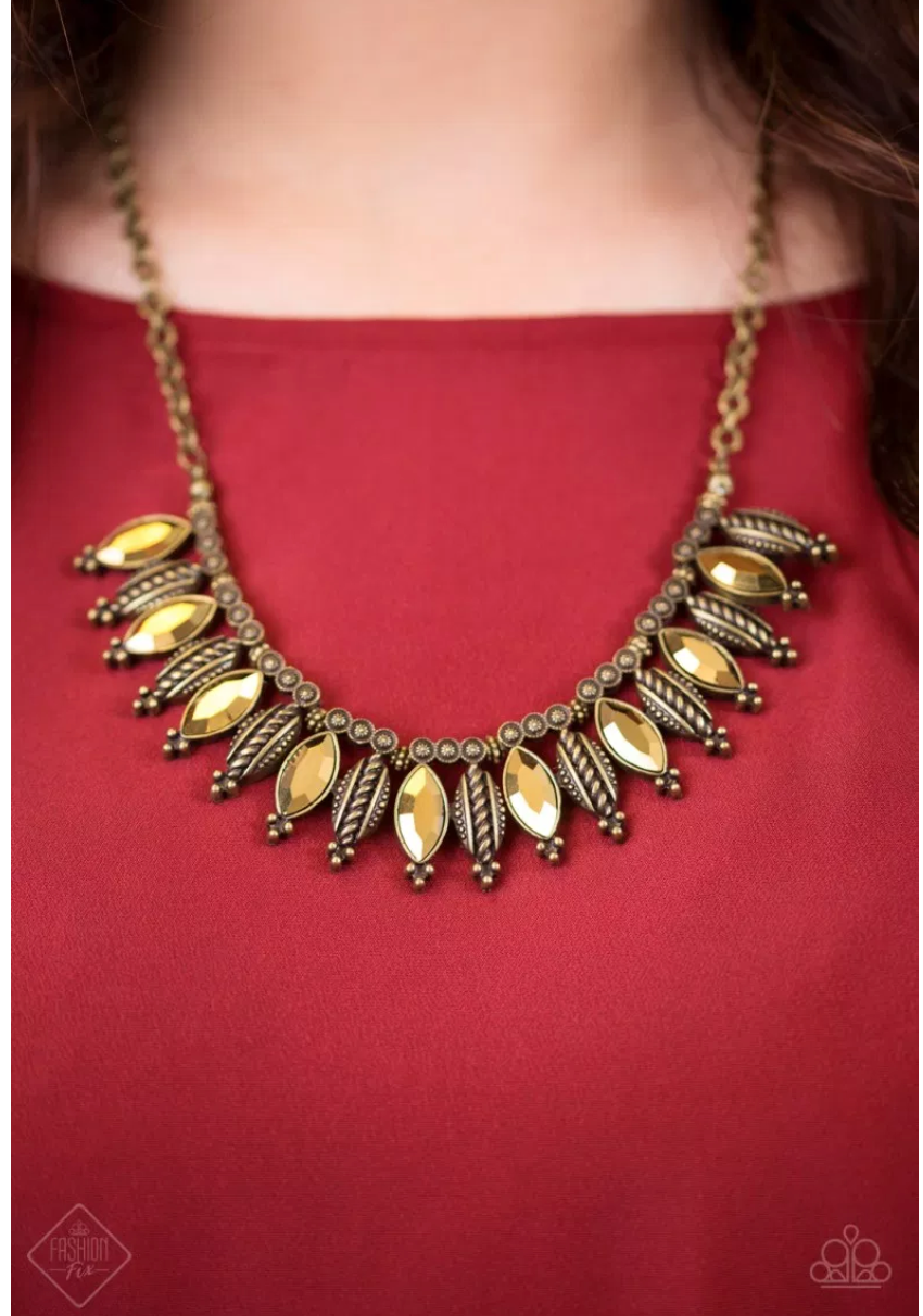 Faceted aurum rhinestones and textured brass frames link below the collar, creating an indigenous inspired fringe. The marquise shape of each frame adds dramatic edge to the design. Features an adjustable clasp closure.